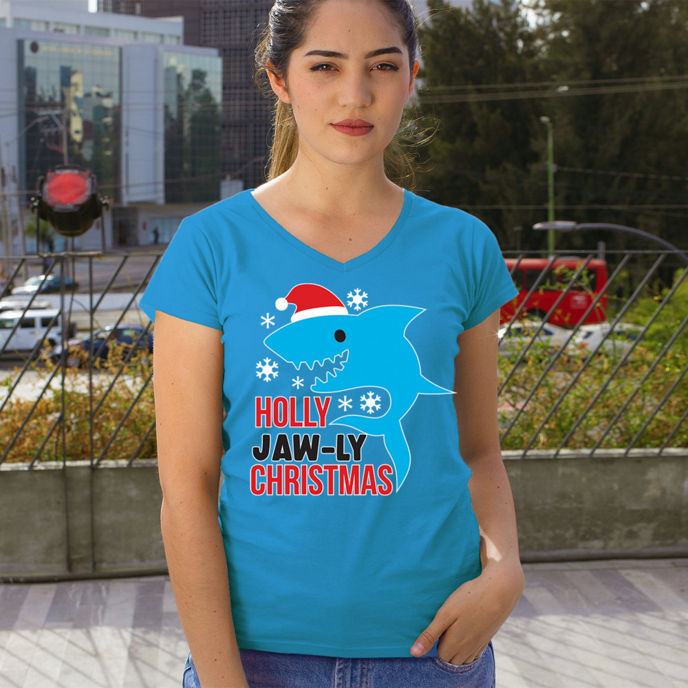 Funny Holly Jaw-ly Christmas shark pun design with Santa hat and snowflakes. Perfect for ocean lovers, festive parties, and cheerful holiday fun.