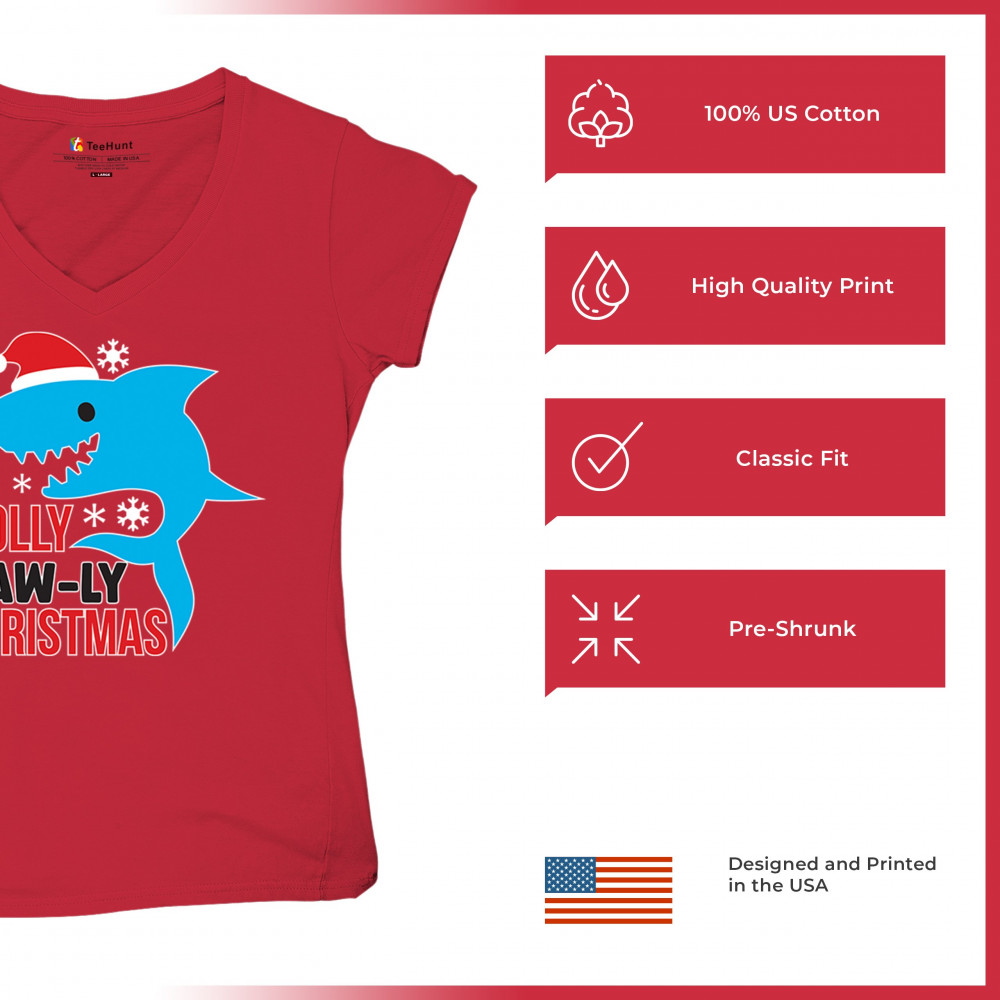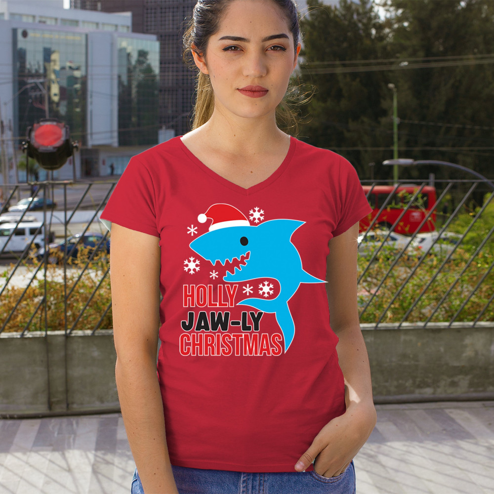 Funny Holly Jaw-ly Christmas shark pun design with Santa hat and snowflakes. Perfect for ocean lovers, festive parties, and cheerful holiday fun.