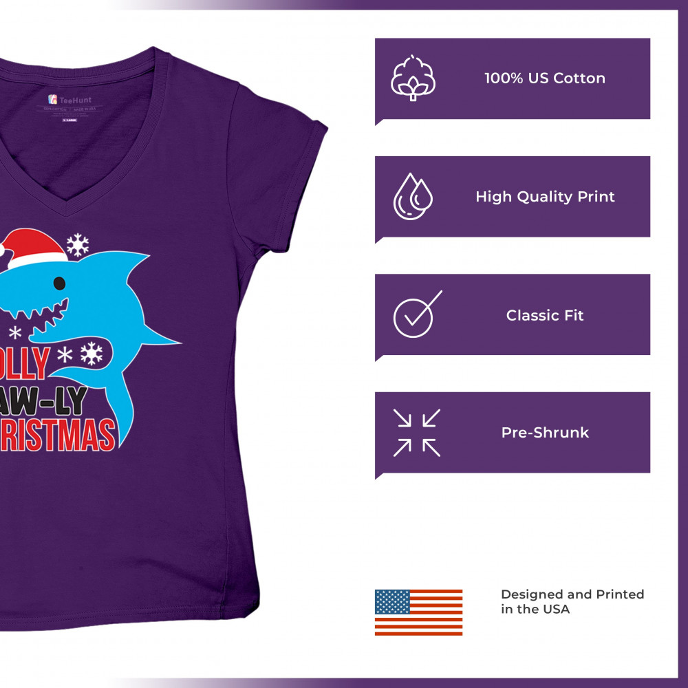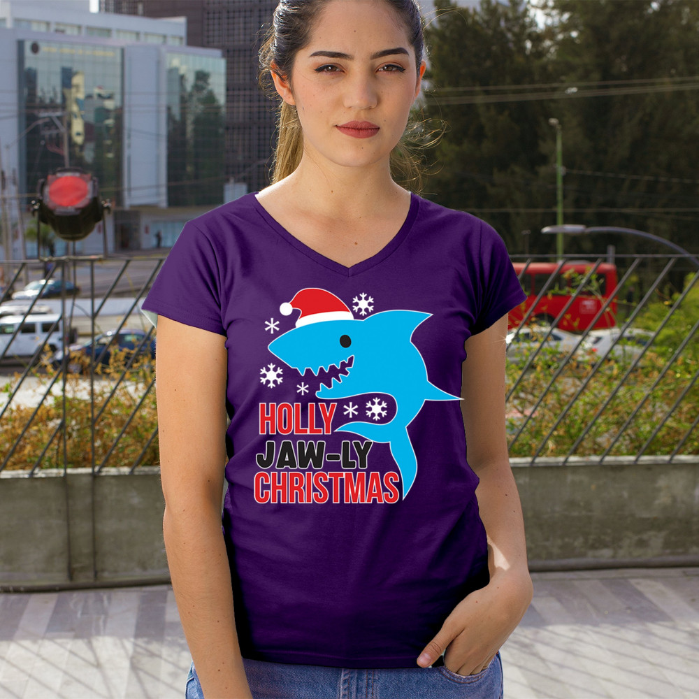 Funny Holly Jaw-ly Christmas shark pun design with Santa hat and snowflakes. Perfect for ocean lovers, festive parties, and cheerful holiday fun.