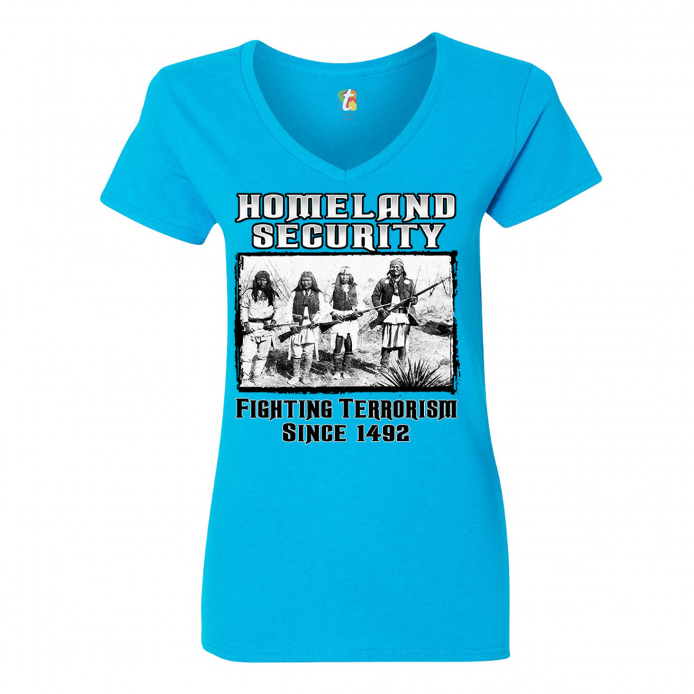 HOMELAND SECURITY women's v-neck t-shirt native american indigenous tribal tee turquoise
