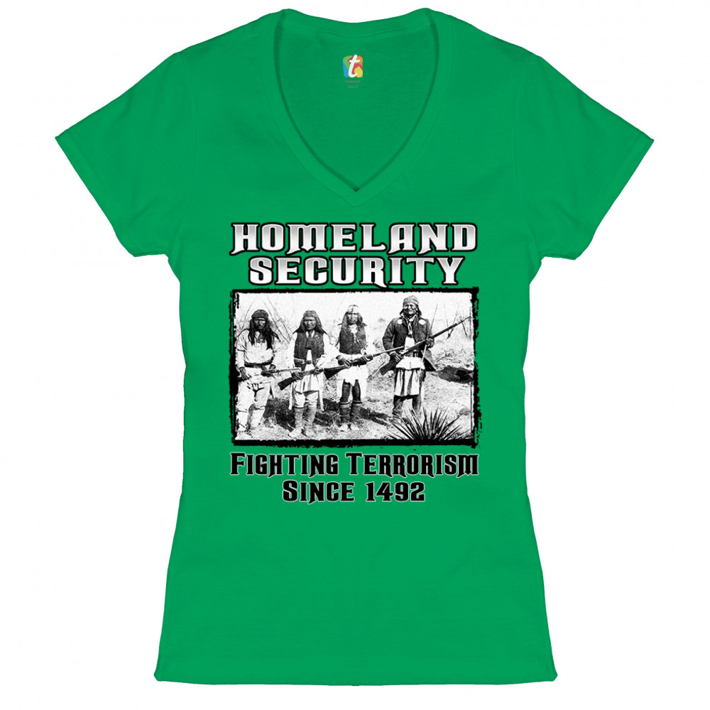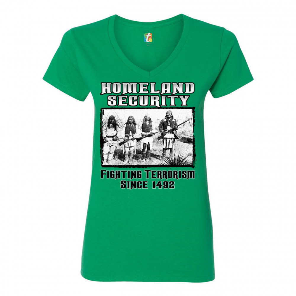 HOMELAND SECURITY women's v-neck t-shirt native american indigenous tribal tee green