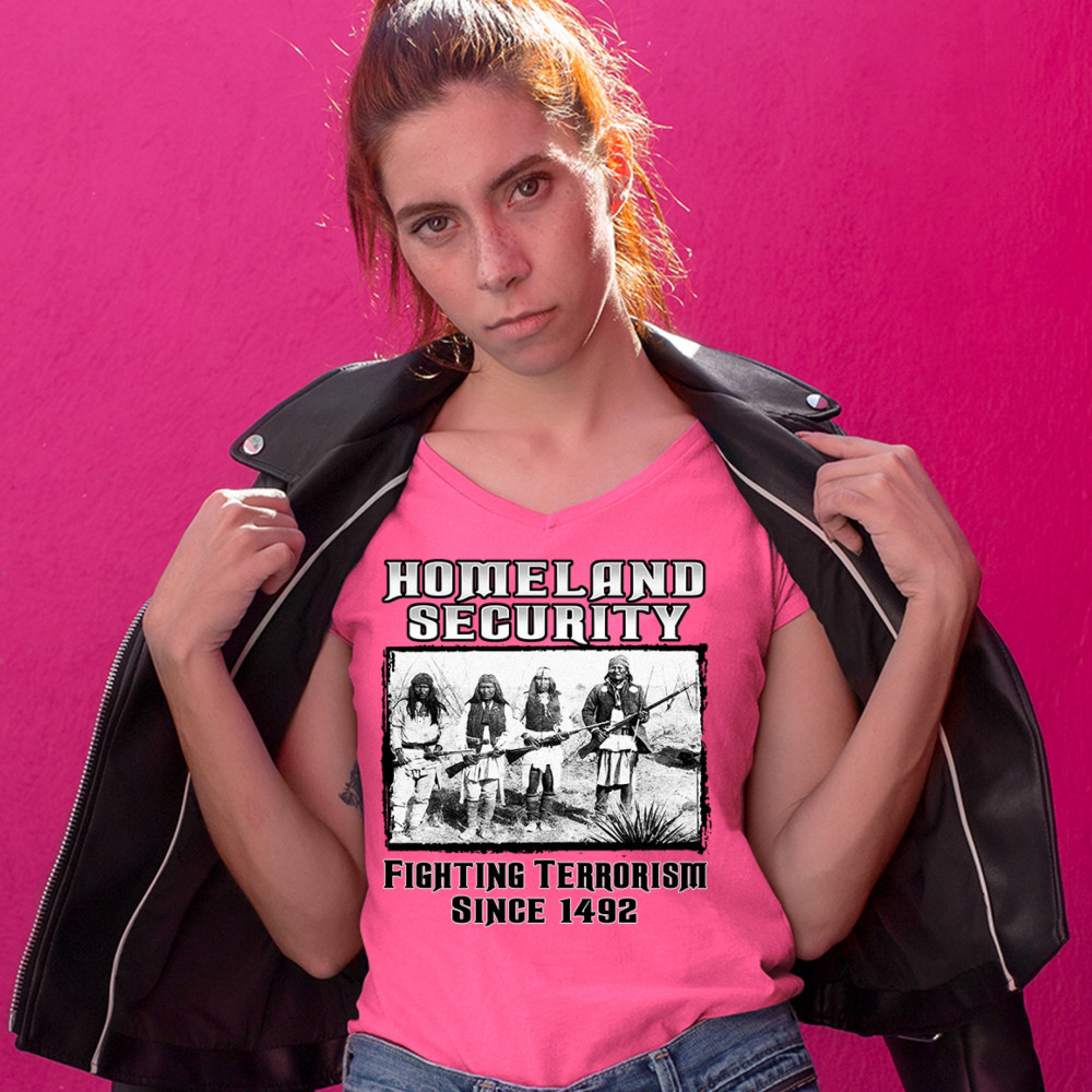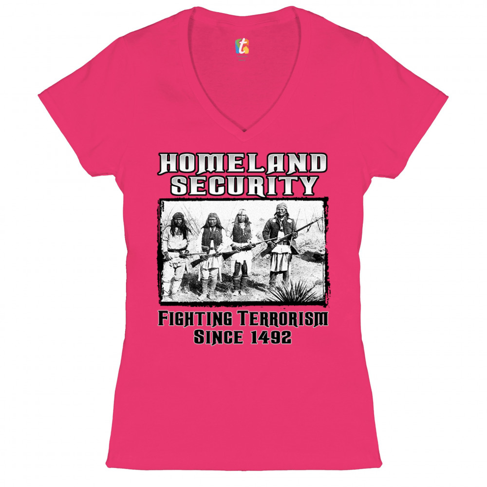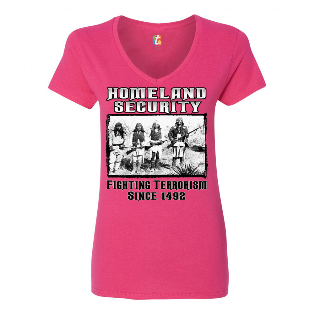 HOMELAND SECURITY women's v-neck t-shirt native american indigenous tribal tee pink