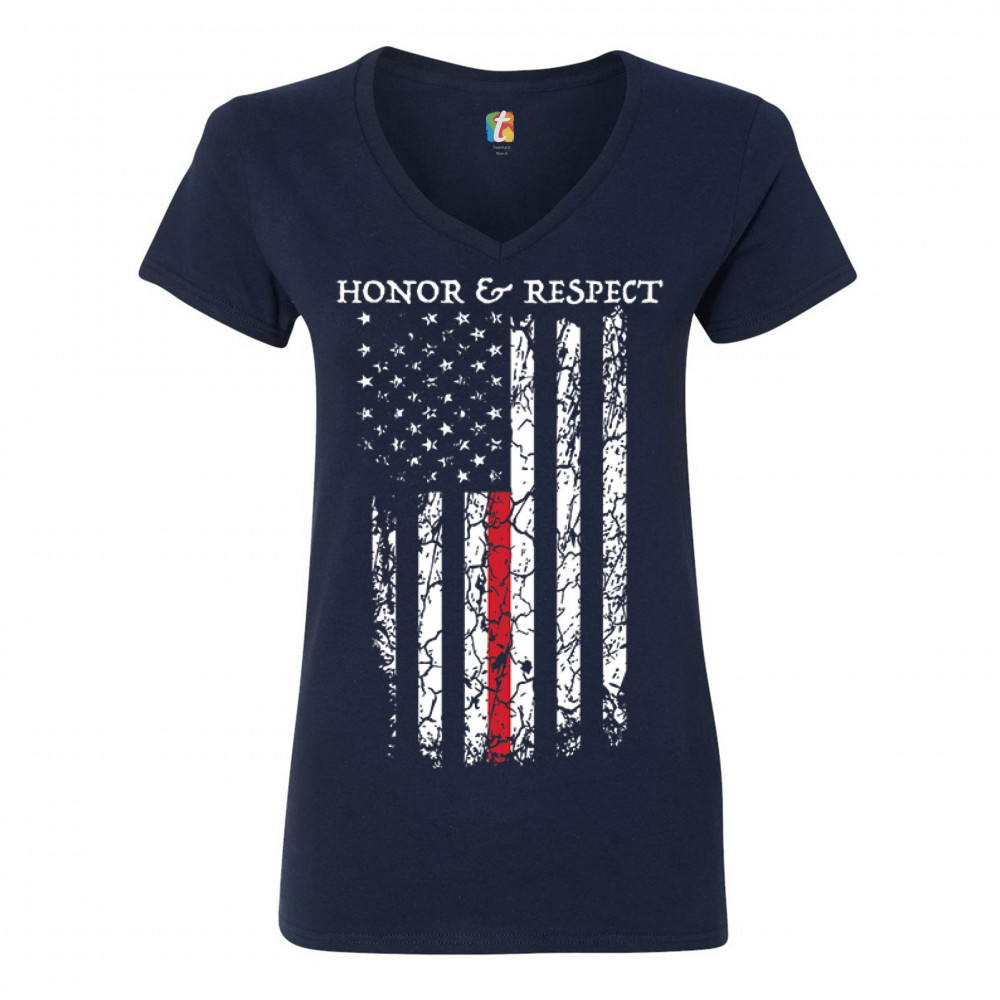HONOR & RESPECT THIN RED LINE women's v-neck t-shirt firefighter patriotic tee navy blue