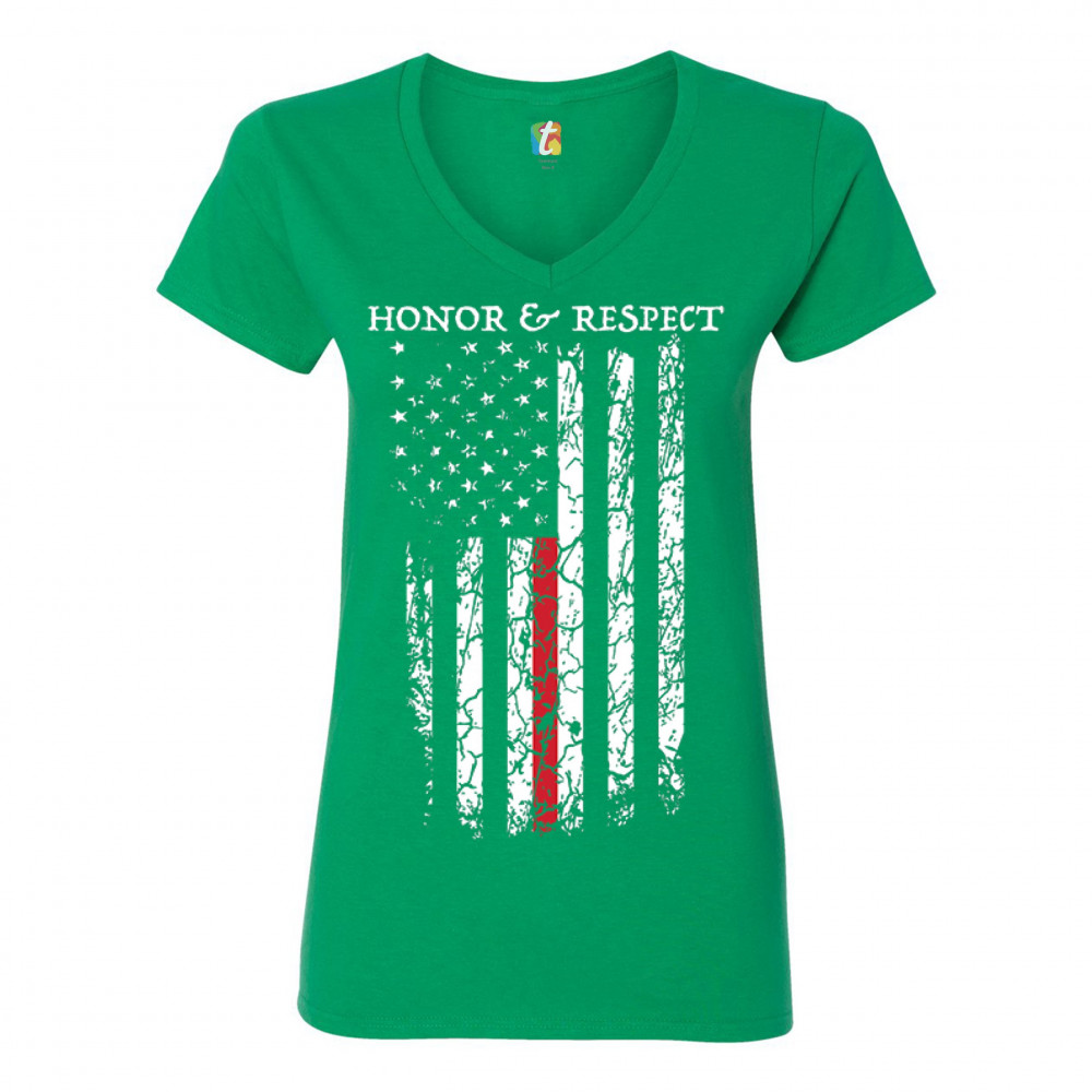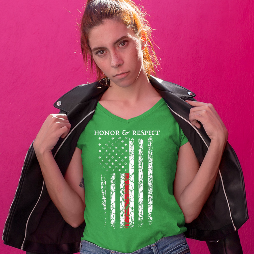 HONOR & RESPECT THIN RED LINE women's v-neck t-shirt firefighter patriotic tee green