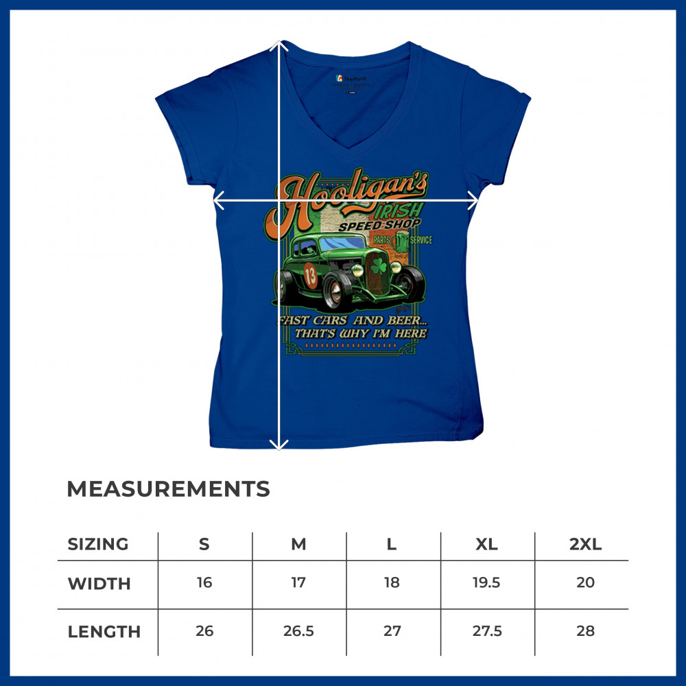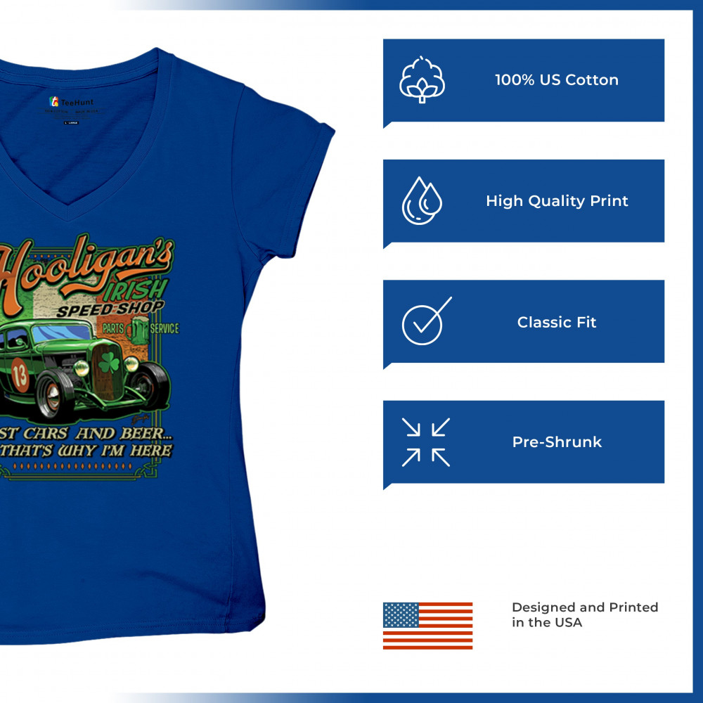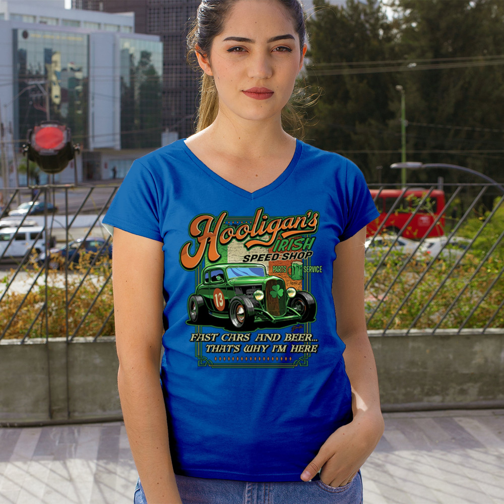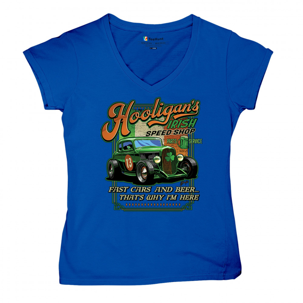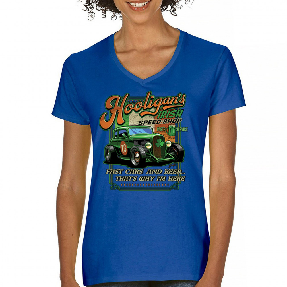 HOOLIGAN'S IRISH SPEED SHOP hooligans irish speed shop st patricks day women's v-neck t-shirt shamrock tee royal blue