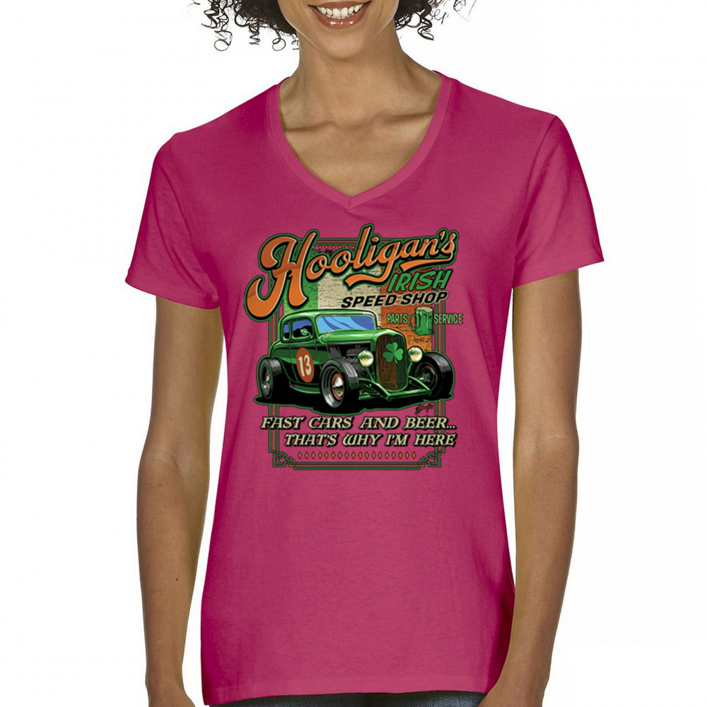 HOOLIGAN'S IRISH SPEED SHOP hooligans irish speed shop st patricks day women's v-neck t-shirt shamrock tee pink