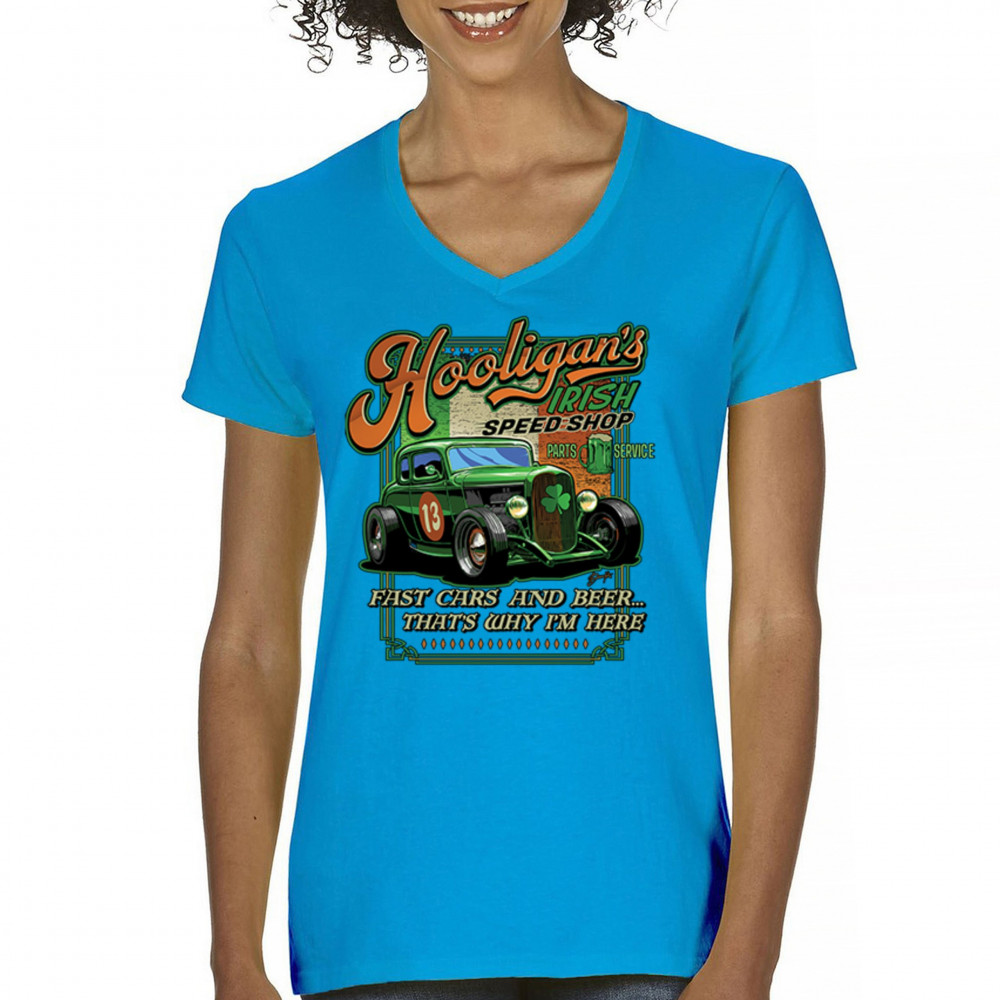 HOOLIGAN'S IRISH SPEED SHOP hooligans irish speed shop st patricks day women's v-neck t-shirt shamrock tee turquoise