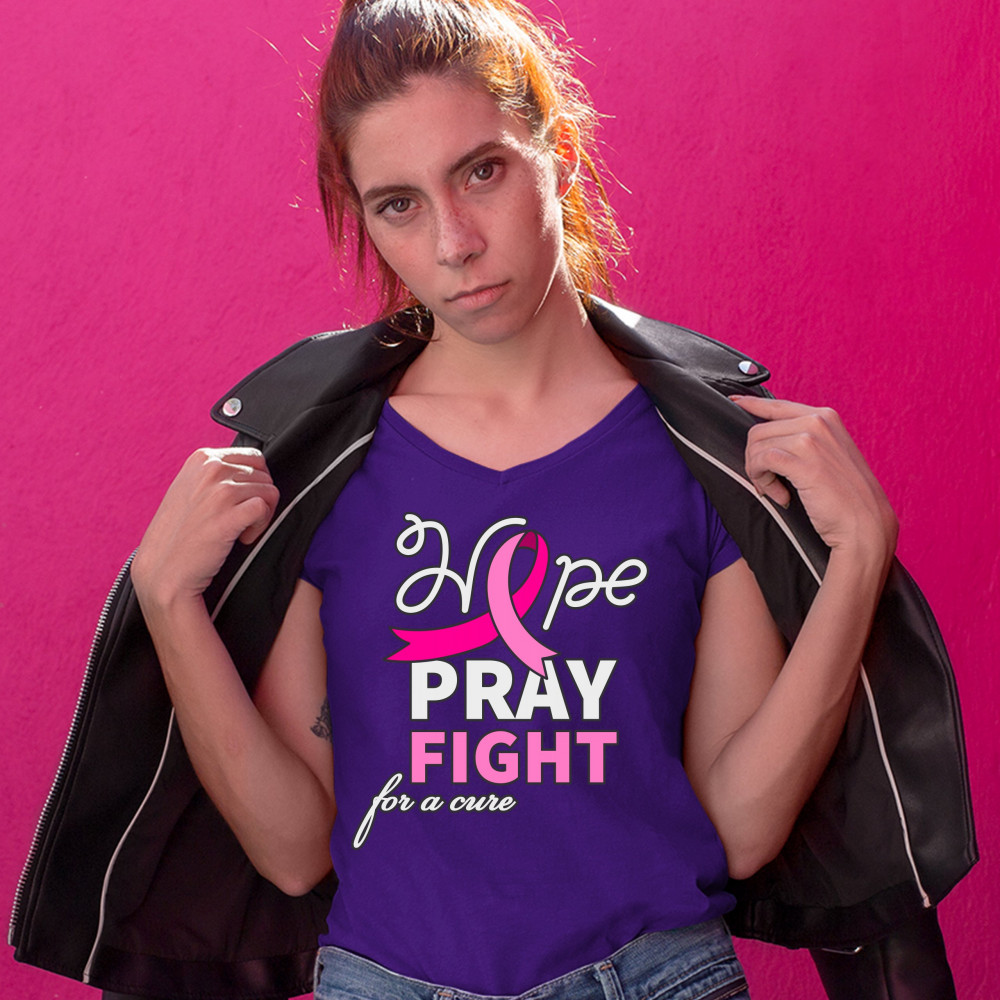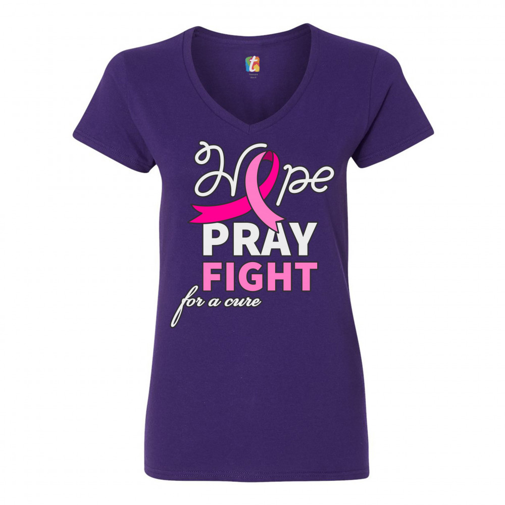 HOPE PRAY FIGHT FOR A CURE women's v-neck t-shirt breast cancer awareness tee purple