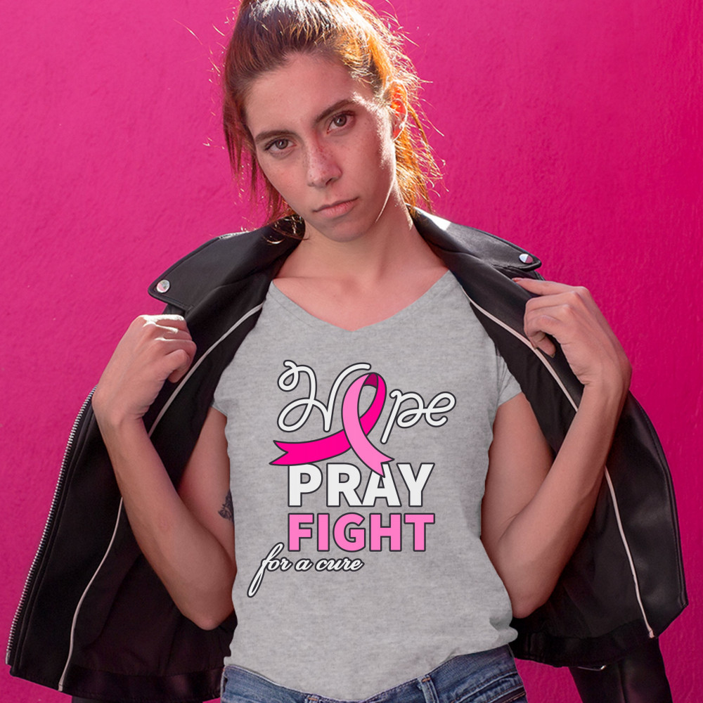 HOPE PRAY FIGHT FOR A CURE women's v-neck t-shirt breast cancer awareness tee gray