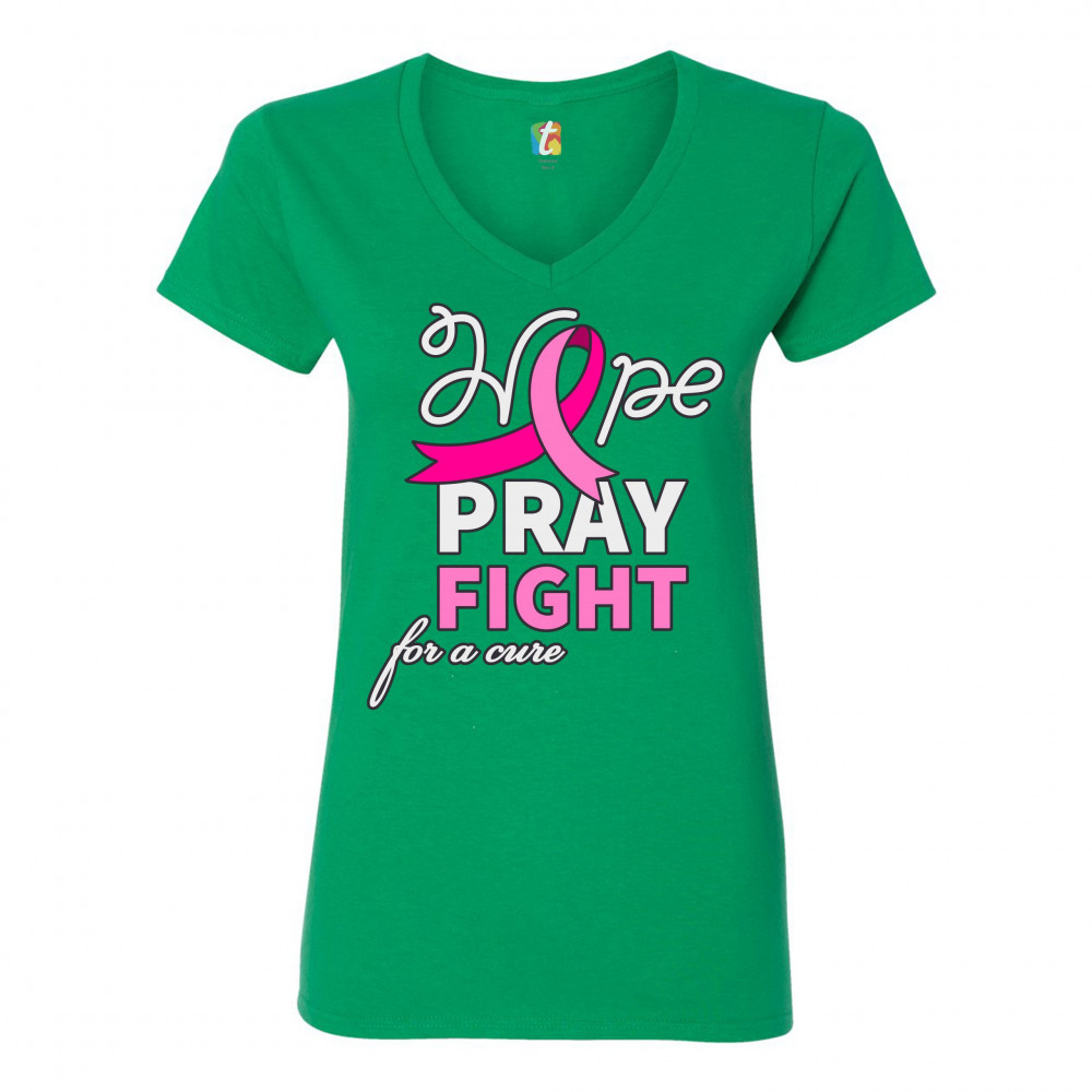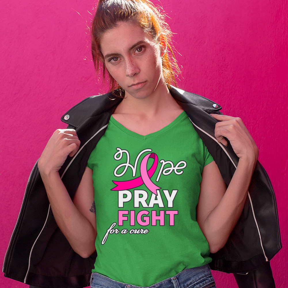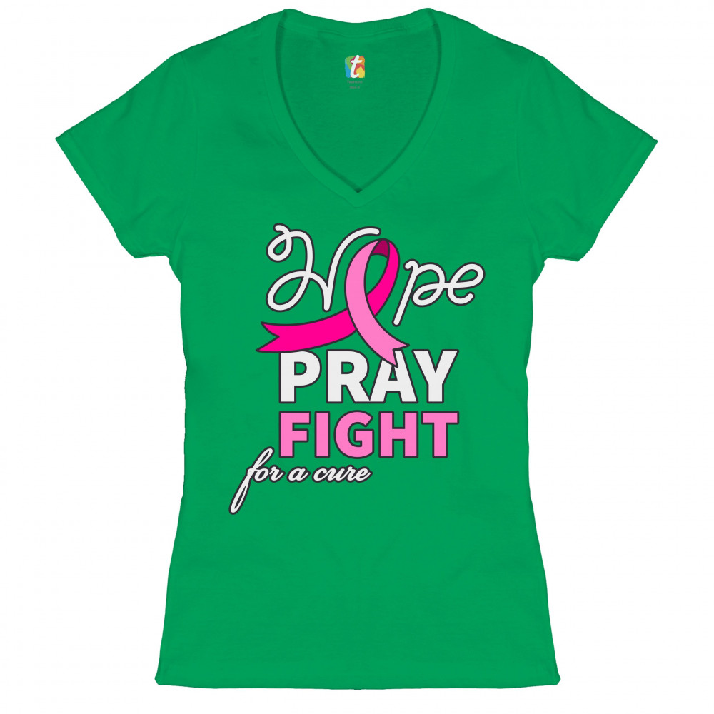 HOPE PRAY FIGHT FOR A CURE women's v-neck t-shirt breast cancer awareness tee green