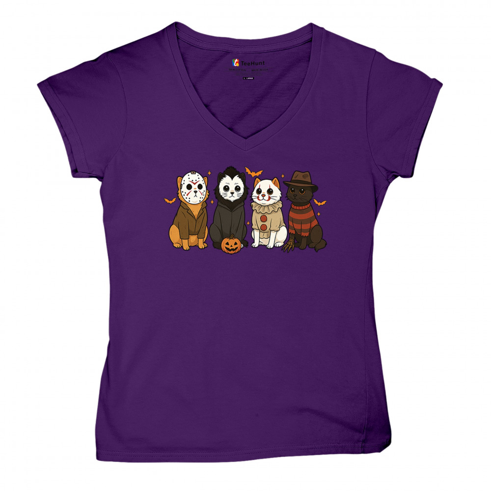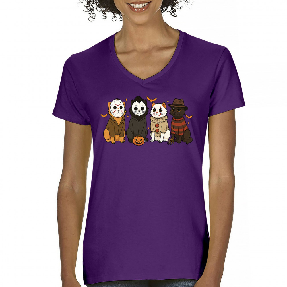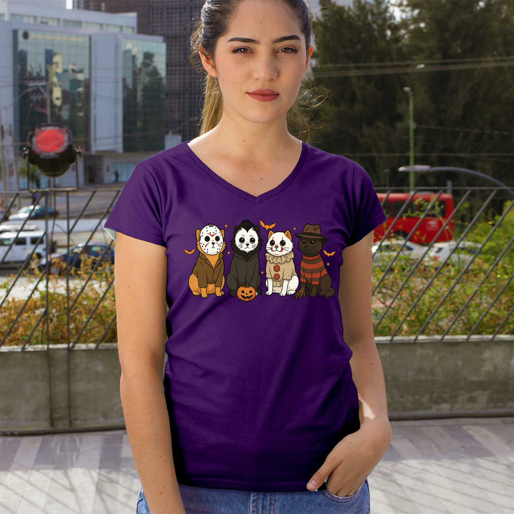 Horror Cats Halloween design with spooky costumes, Jack o Lantern details, and Haunted House vibes. Perfect October 31 outfit for cat lovers.