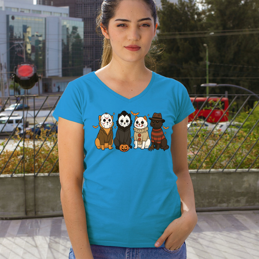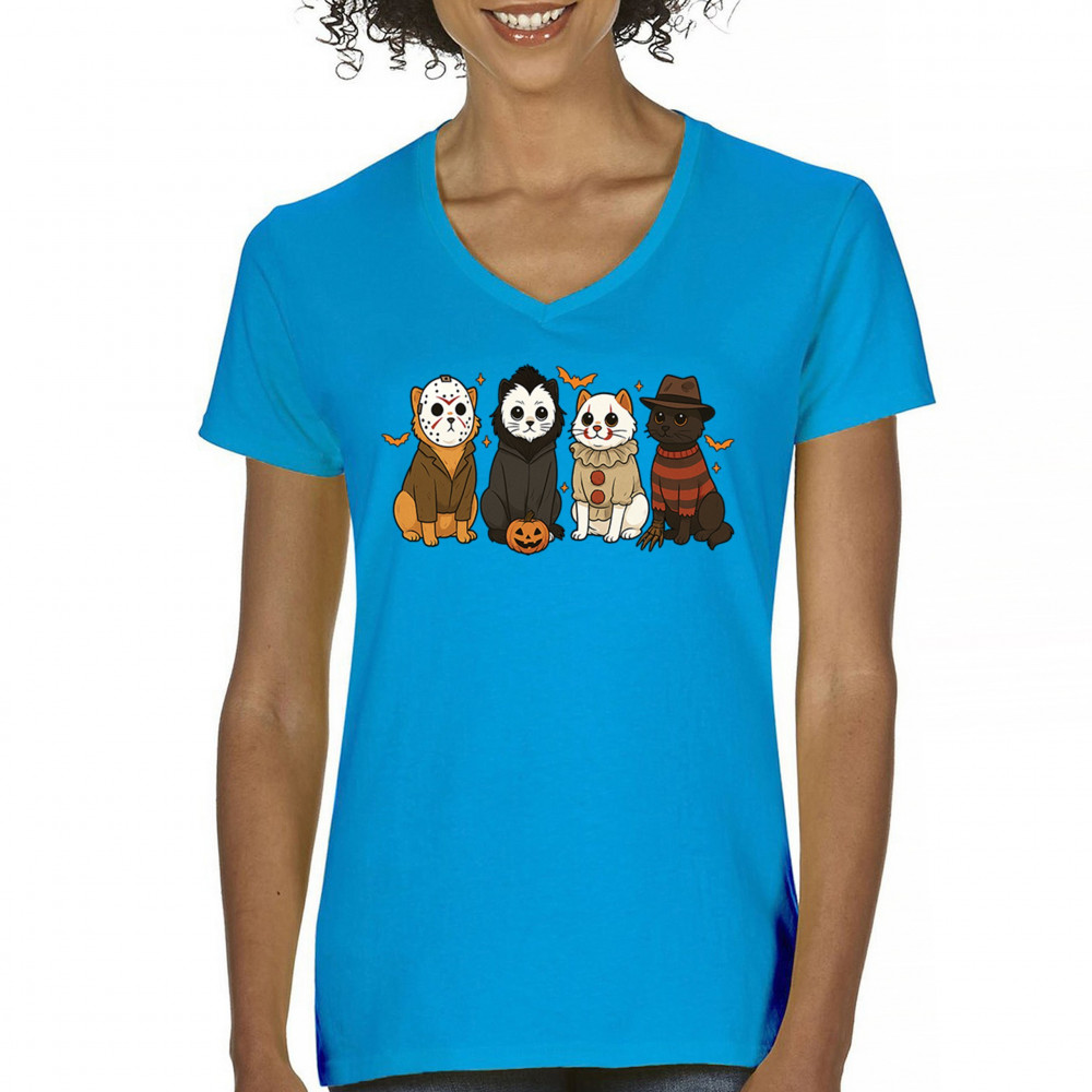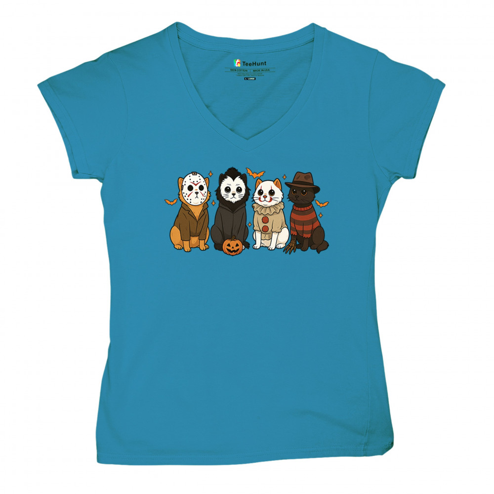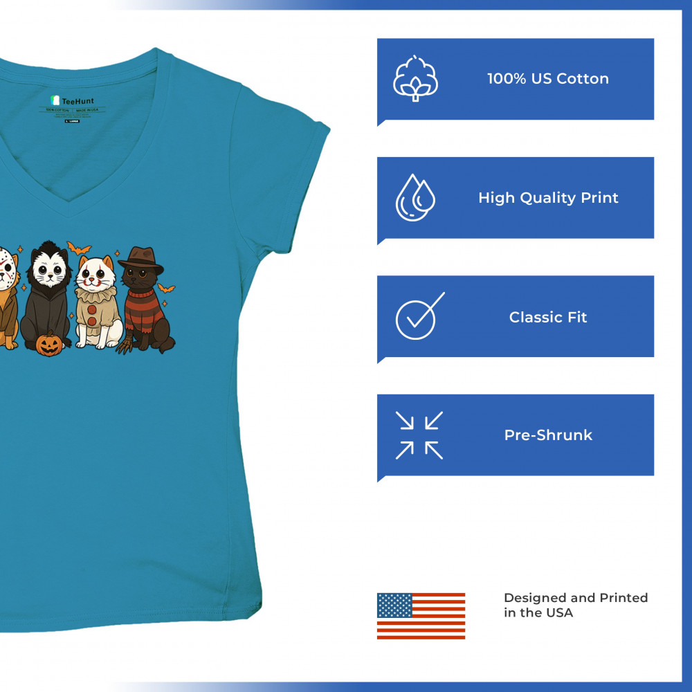Horror Cats Halloween design with spooky costumes, Jack o Lantern details, and Haunted House vibes. Perfect October 31 outfit for cat lovers.
