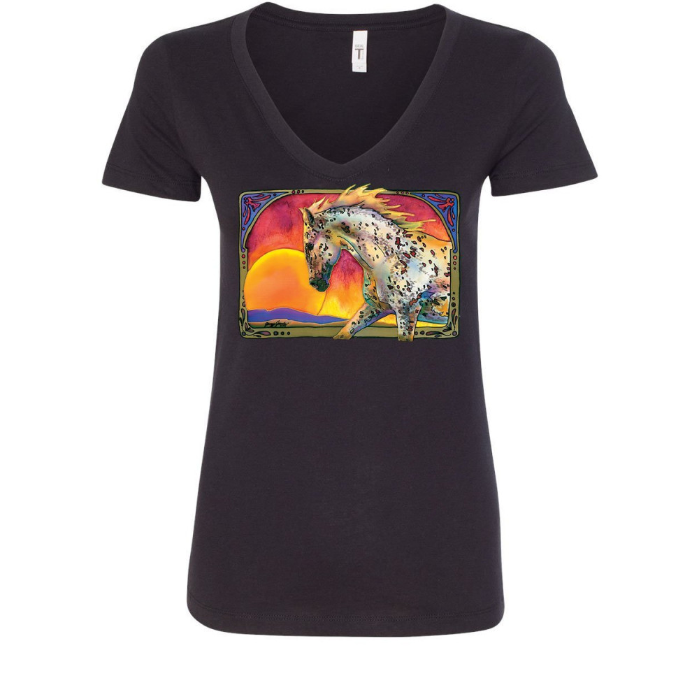 HORSE PRANCING IN SUNSET women's v-neck t-shirt animal wildlife mare stallion black