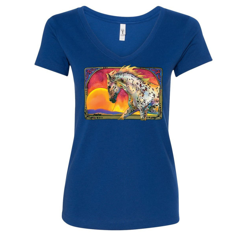 HORSE PRANCING IN SUNSET women's v-neck t-shirt animal wildlife mare stallion royal blue