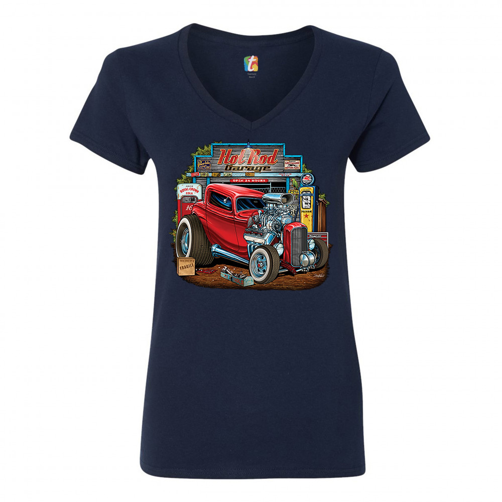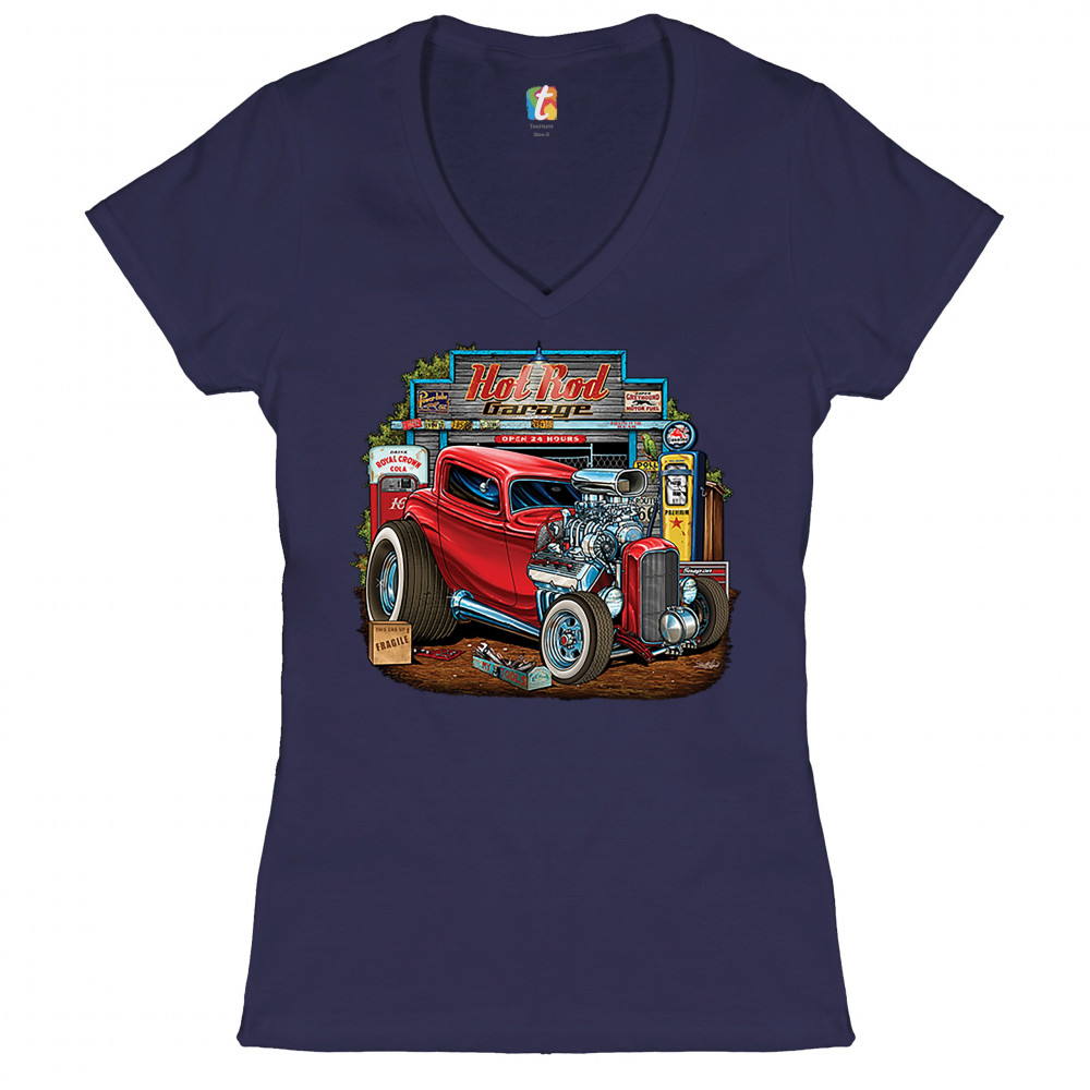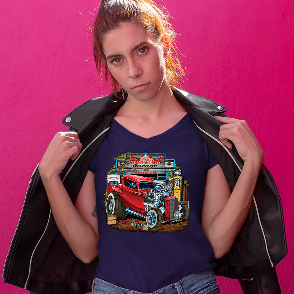 A print featuring a vintage hot rod with an exposed engine and plus-sized rear wheels. In the background there is a garage with a gas station and a sign that says: "Hot Rod Garage". A great choice for a fan of customized American classic cars and hot rods
