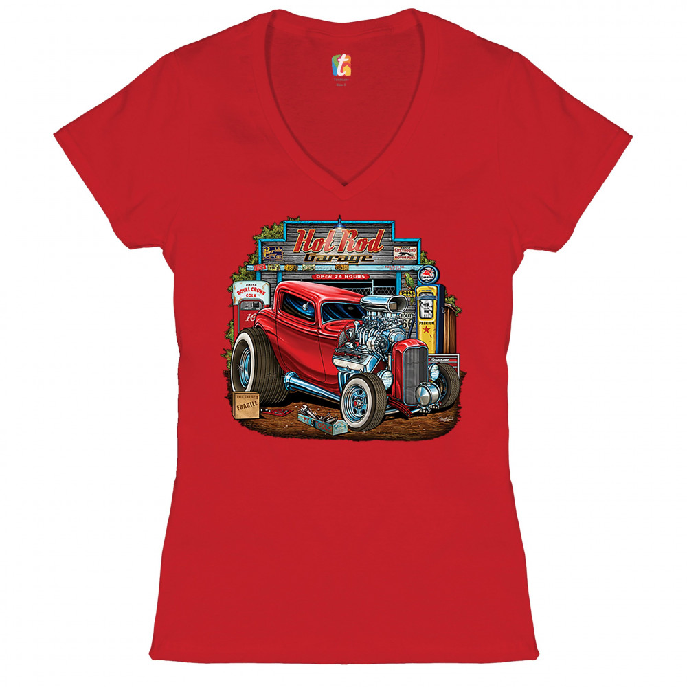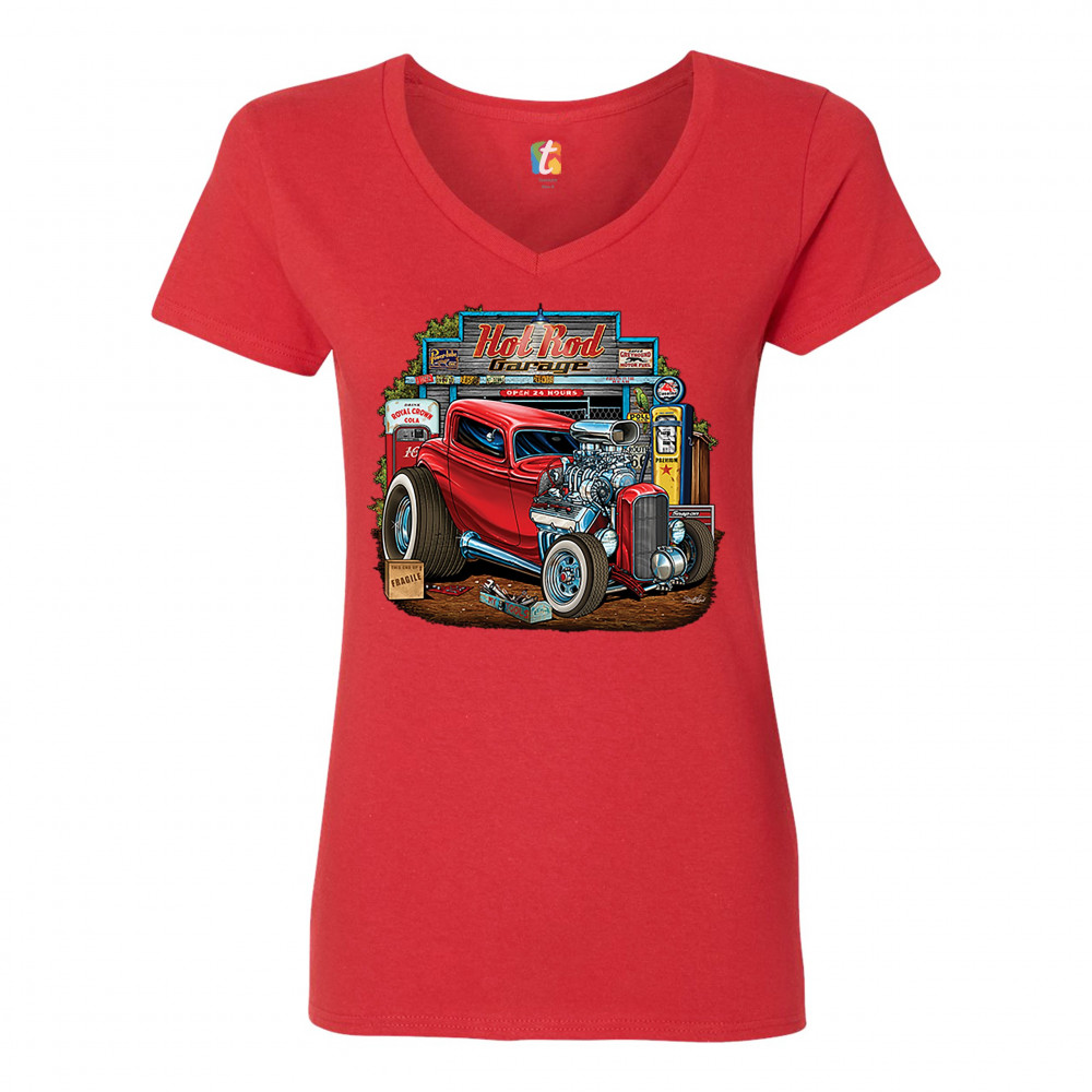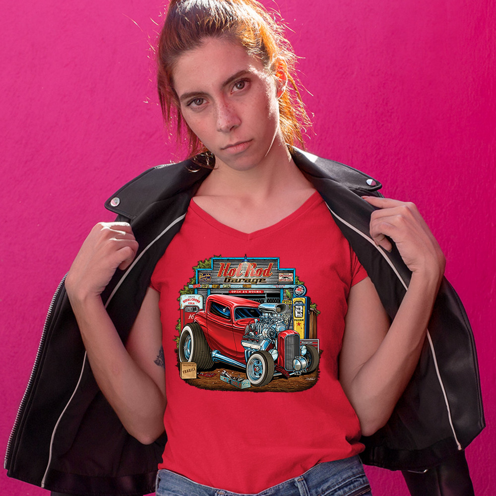 A print featuring a vintage hot rod with an exposed engine and plus-sized rear wheels. In the background there is a garage with a gas station and a sign that says: "Hot Rod Garage". A great choice for a fan of customized American classic cars and hot rods