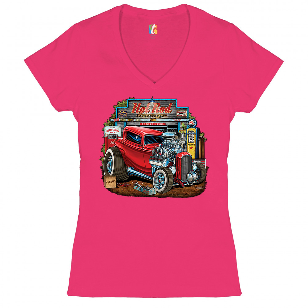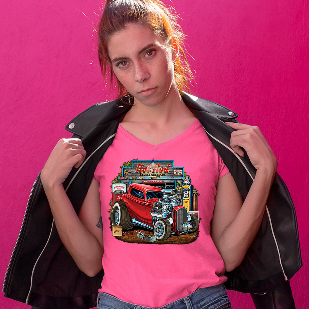 A print featuring a vintage hot rod with an exposed engine and plus-sized rear wheels. In the background there is a garage with a gas station and a sign that says: "Hot Rod Garage". A great choice for a fan of customized American classic cars and hot rods