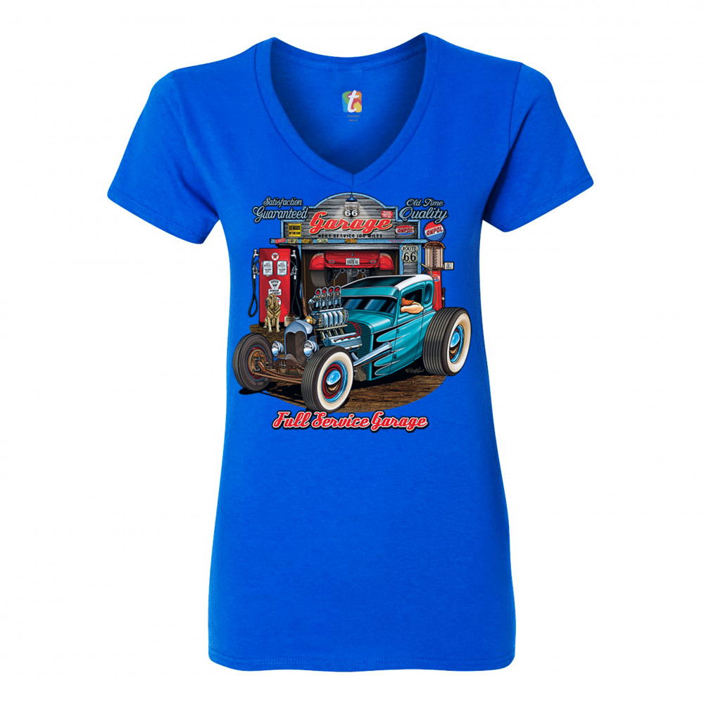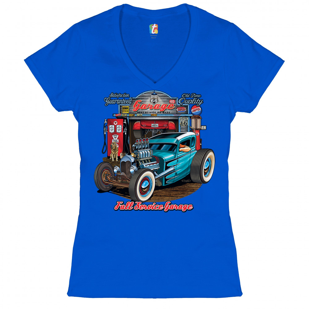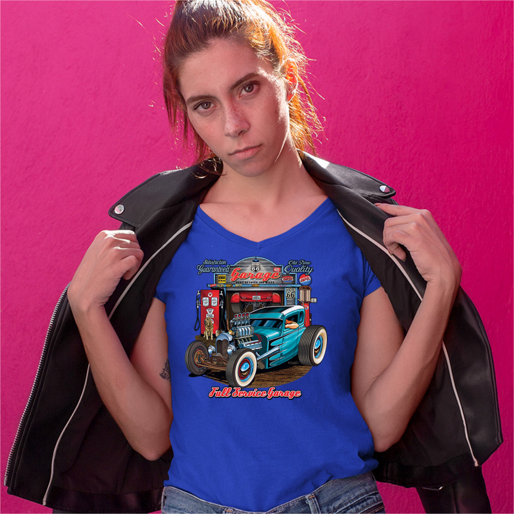 A print featuring a beautiful blue hot rod and a garage behind it. The garage has numerous signs on it which says :"Satisfaction guaranteed", "Old time quality", "Historic Route 66". Under the car it says: "Full service garage". Great for Route 66 and hot rod fans.