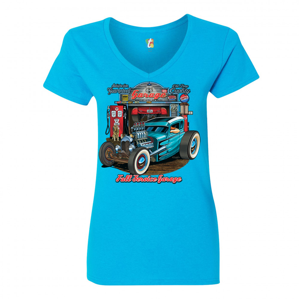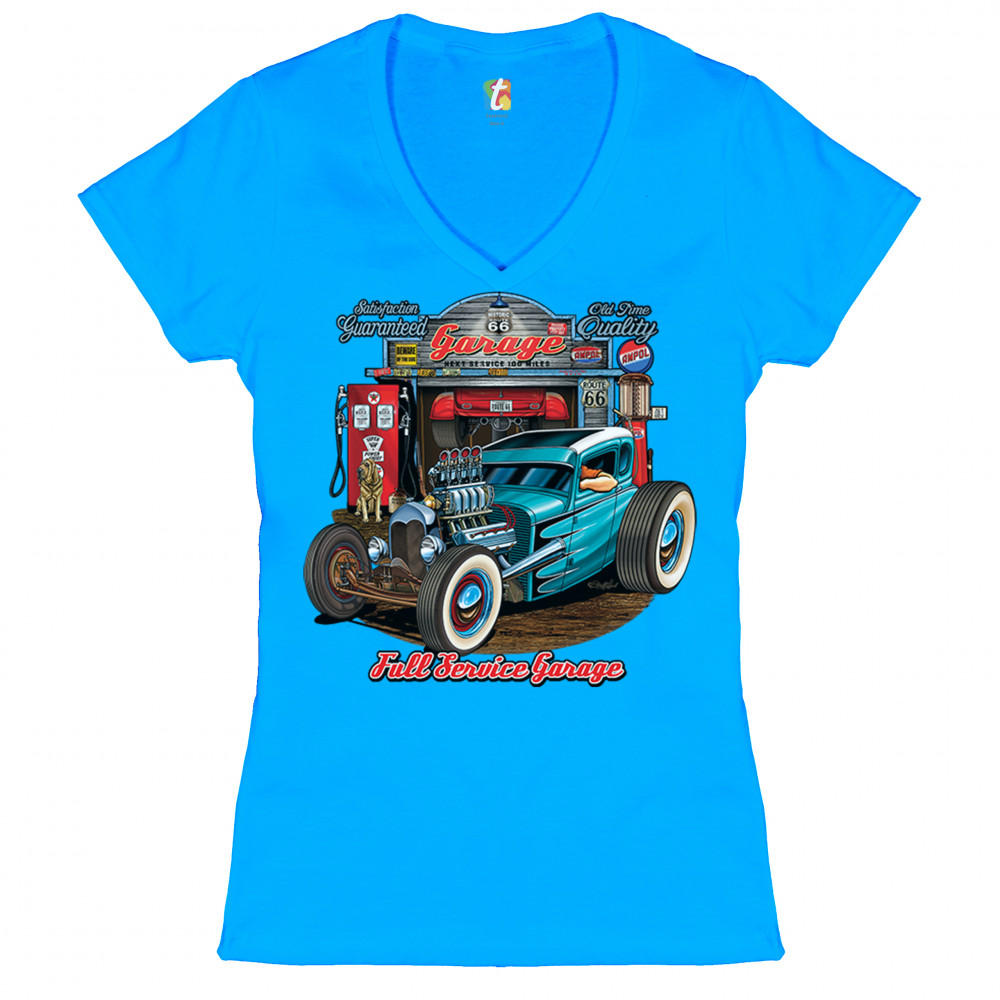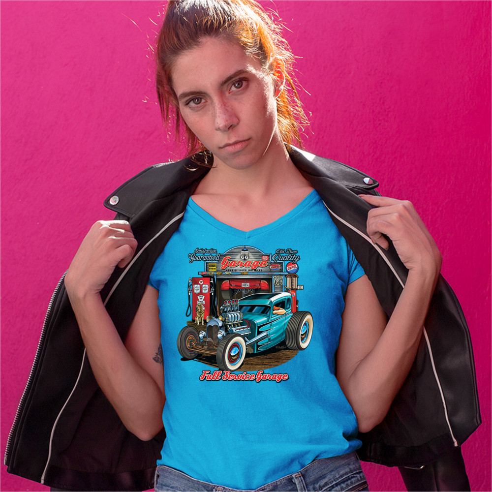 A print featuring a beautiful blue hot rod and a garage behind it. The garage has numerous signs on it which says :"Satisfaction guaranteed", "Old time quality", "Historic Route 66". Under the car it says: "Full service garage". Great for Route 66 and hot rod fans.
