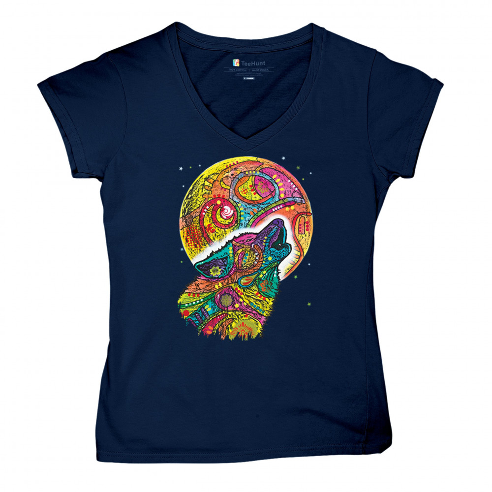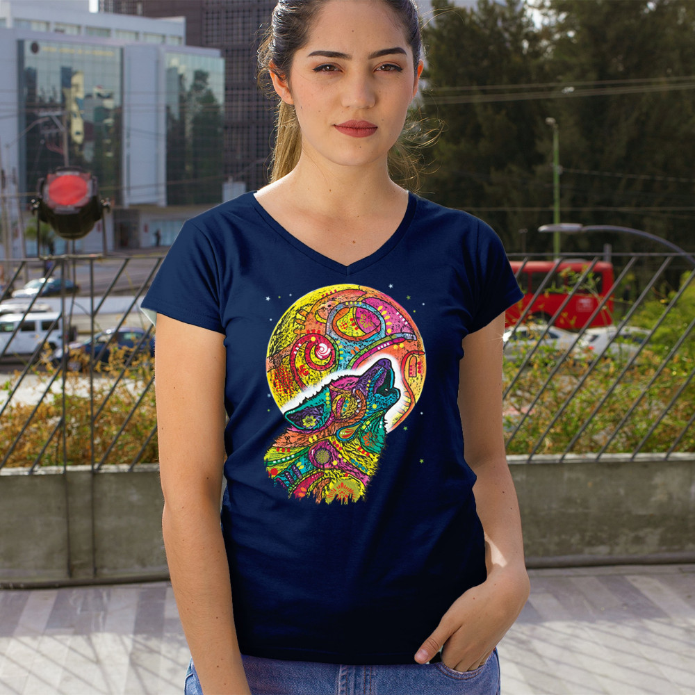 HOWLING WOLF AND MOON women's v-neck t-shirt dean russo colorful wild life tee navy blue