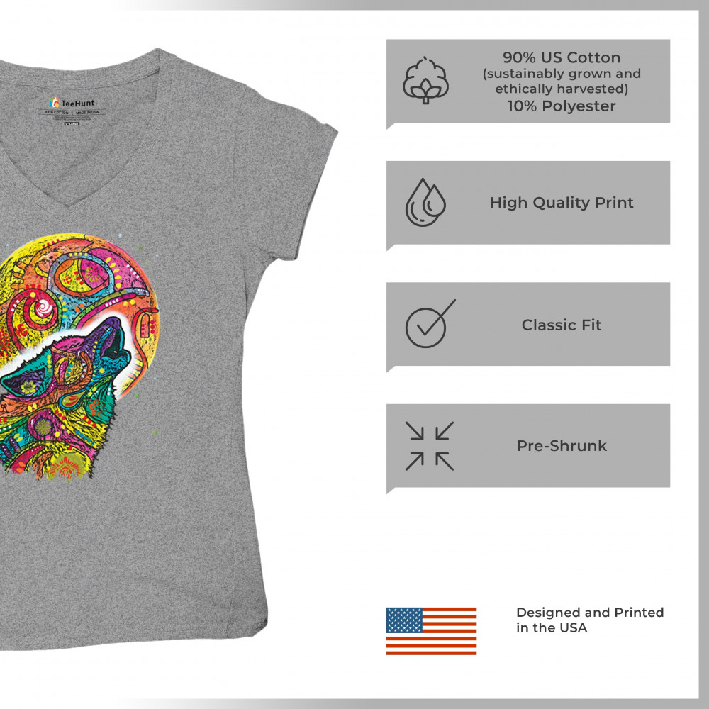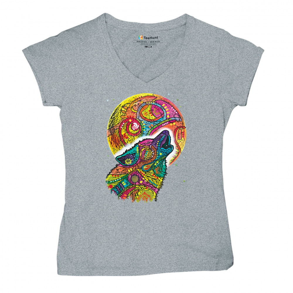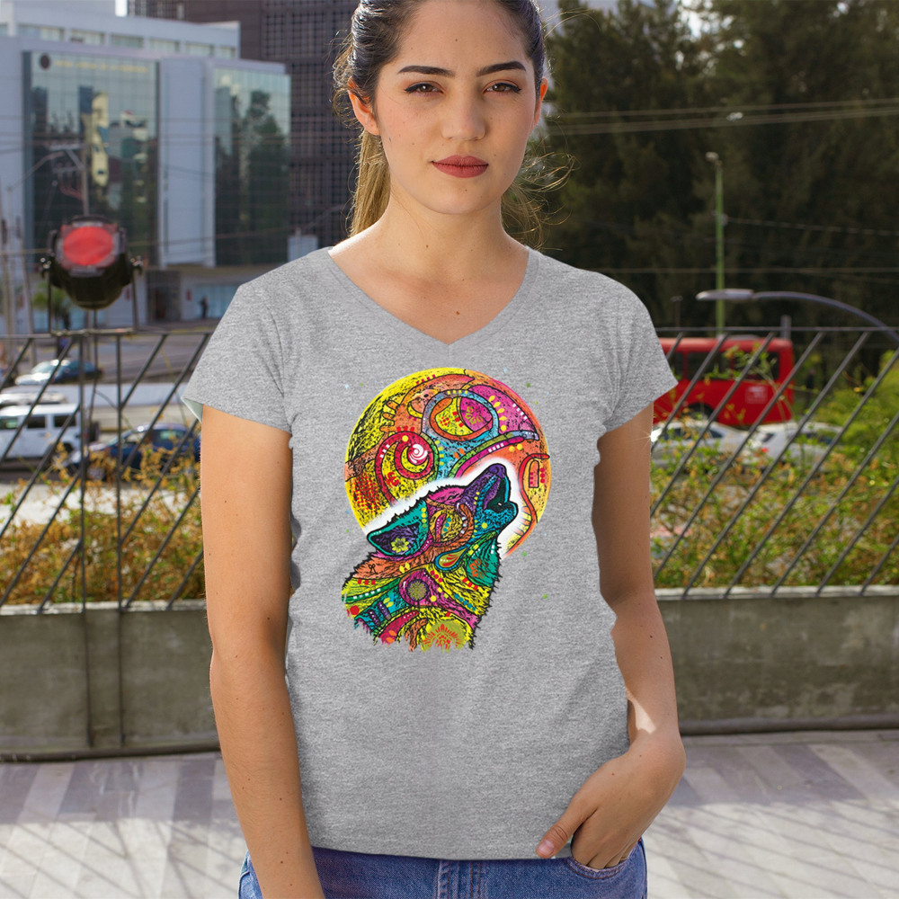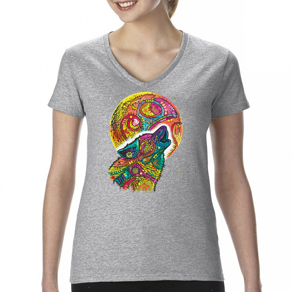 HOWLING WOLF AND MOON women's v-neck t-shirt dean russo colorful wild life tee gray