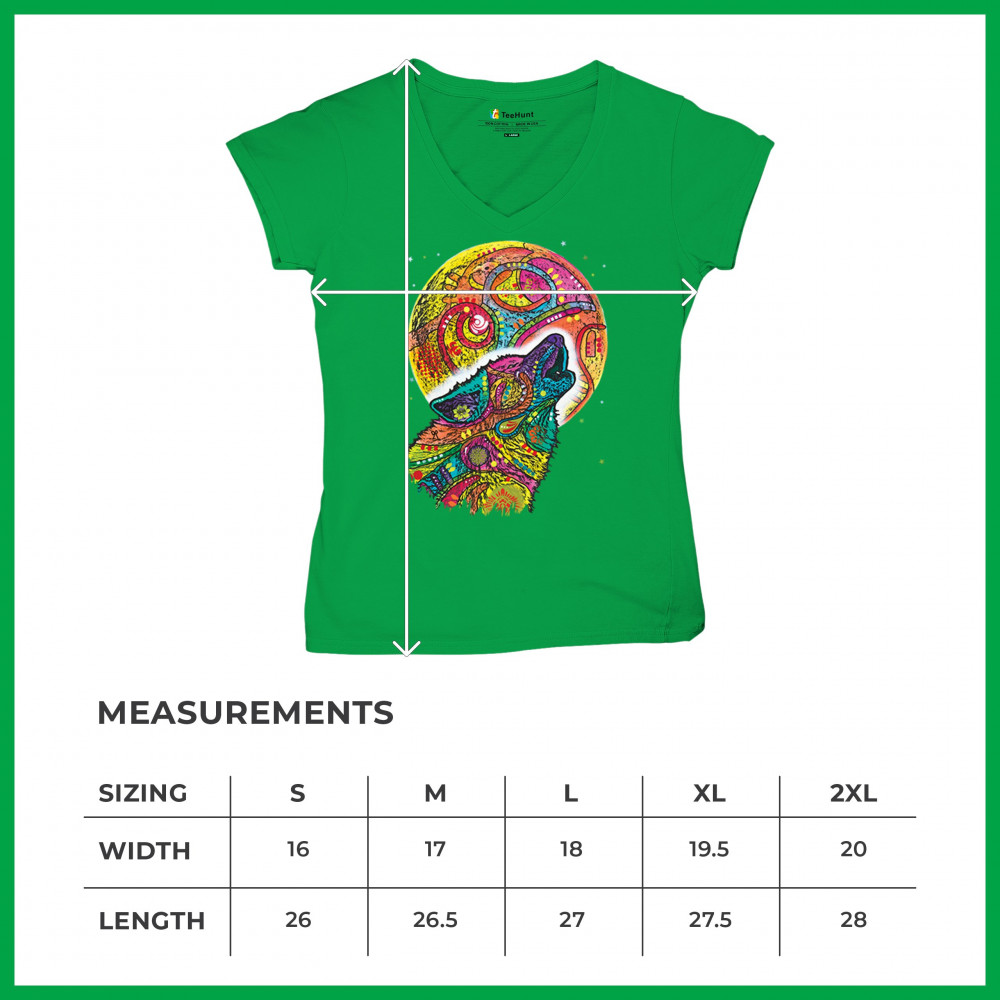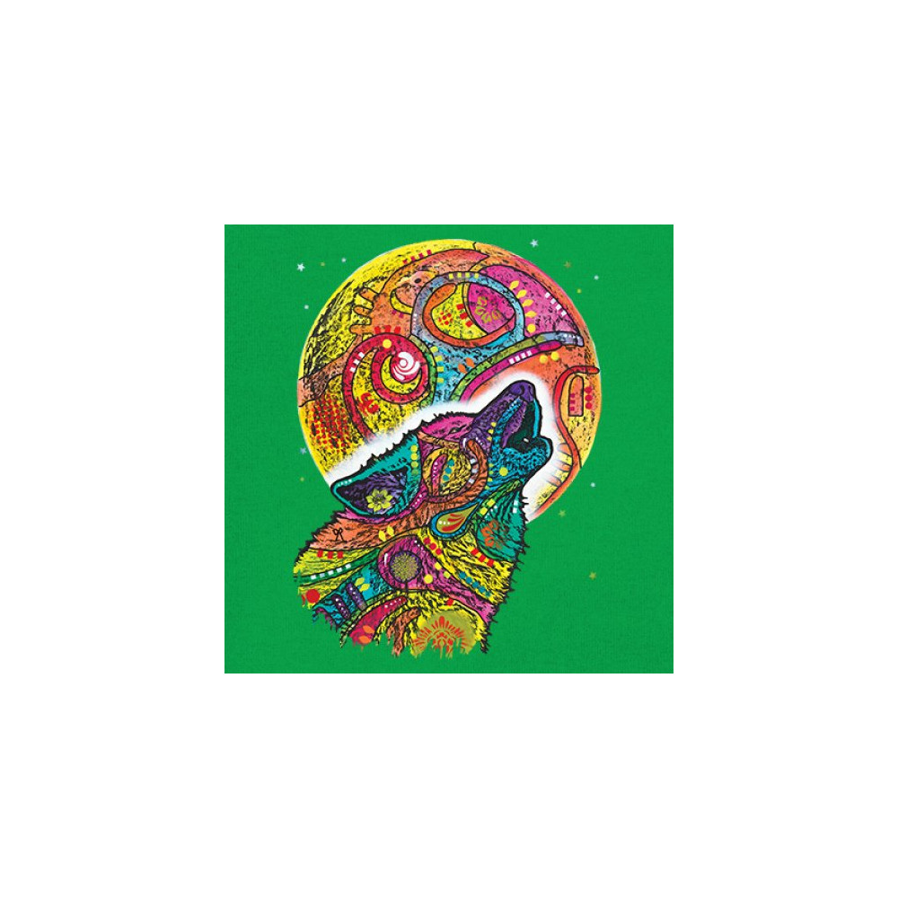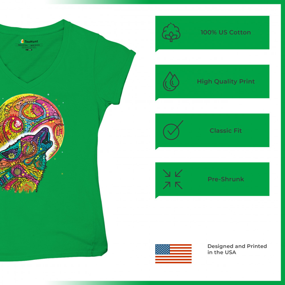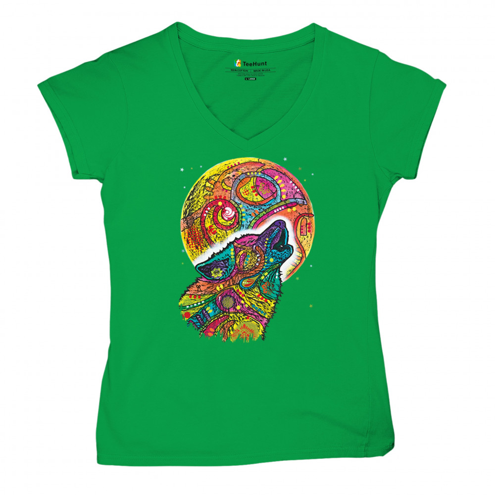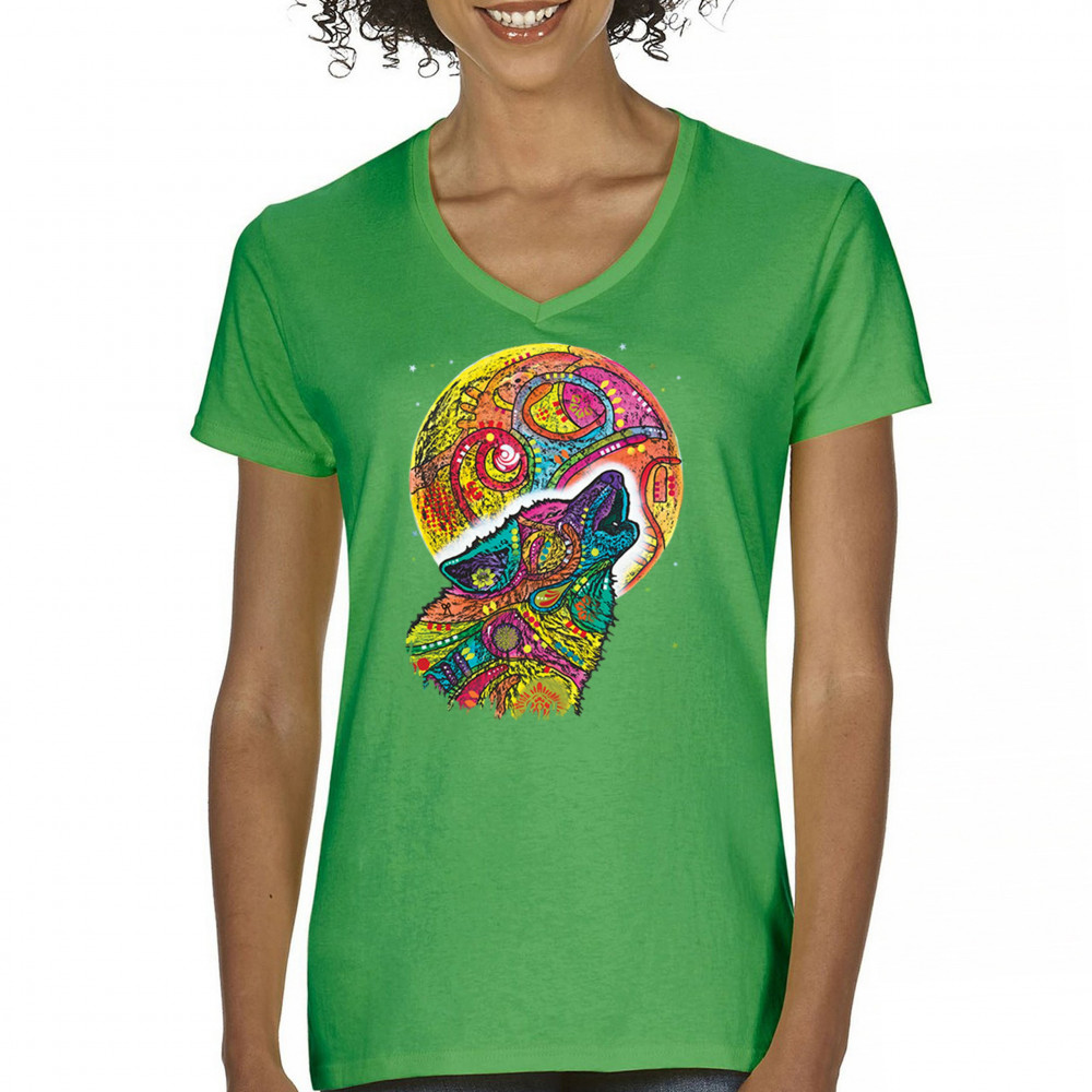HOWLING WOLF AND MOON women's v-neck t-shirt dean russo colorful wild life tee green
