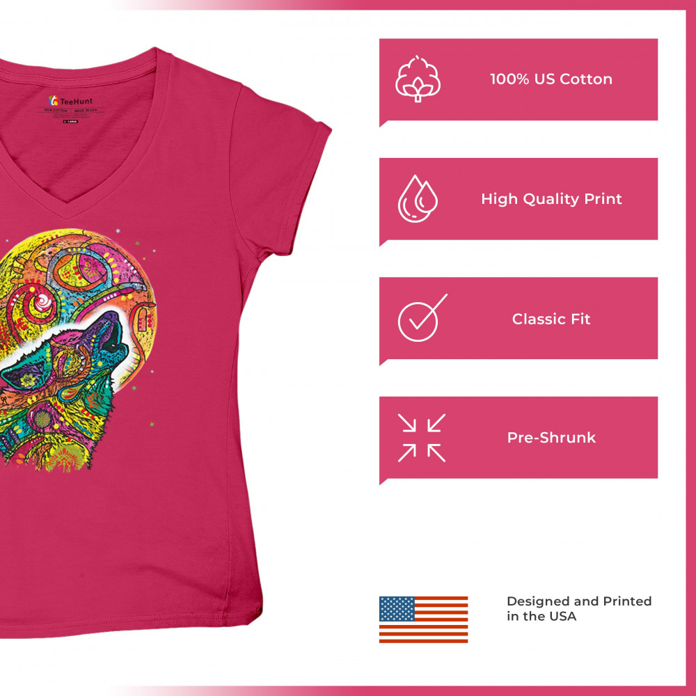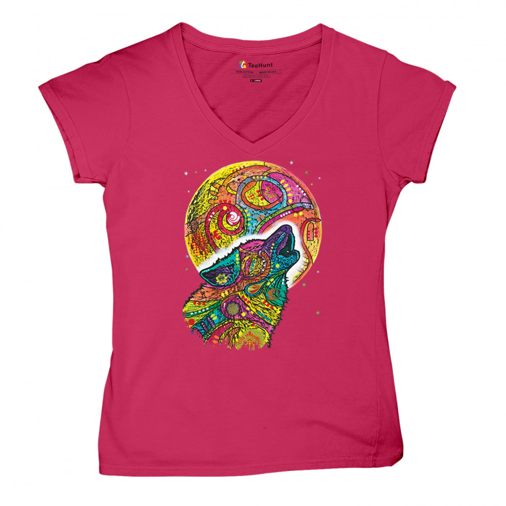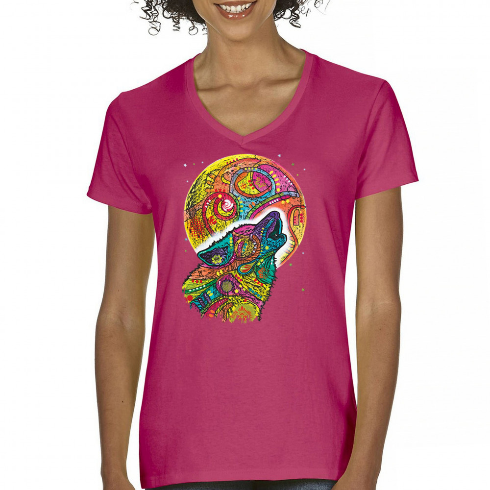 HOWLING WOLF AND MOON women's v-neck t-shirt dean russo colorful wild life tee pink