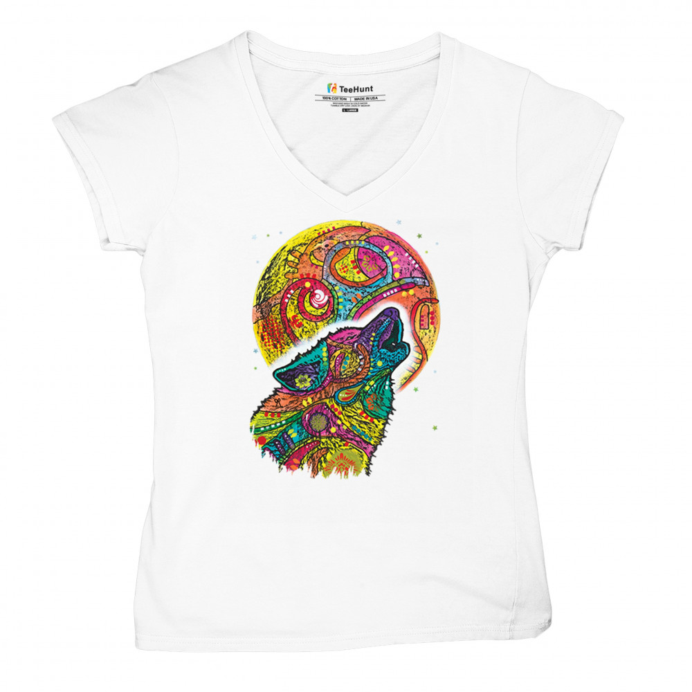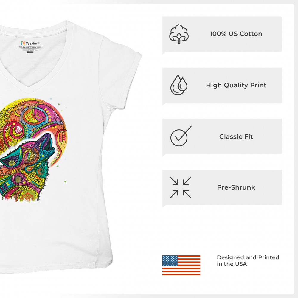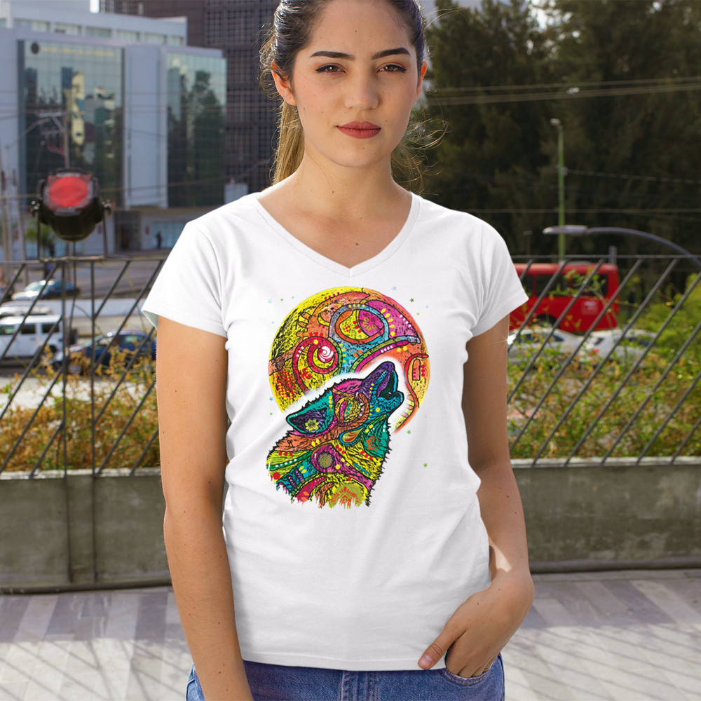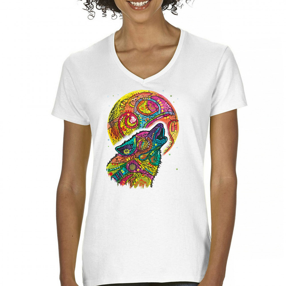 HOWLING WOLF AND MOON women's v-neck t-shirt dean russo colorful wild life tee white
