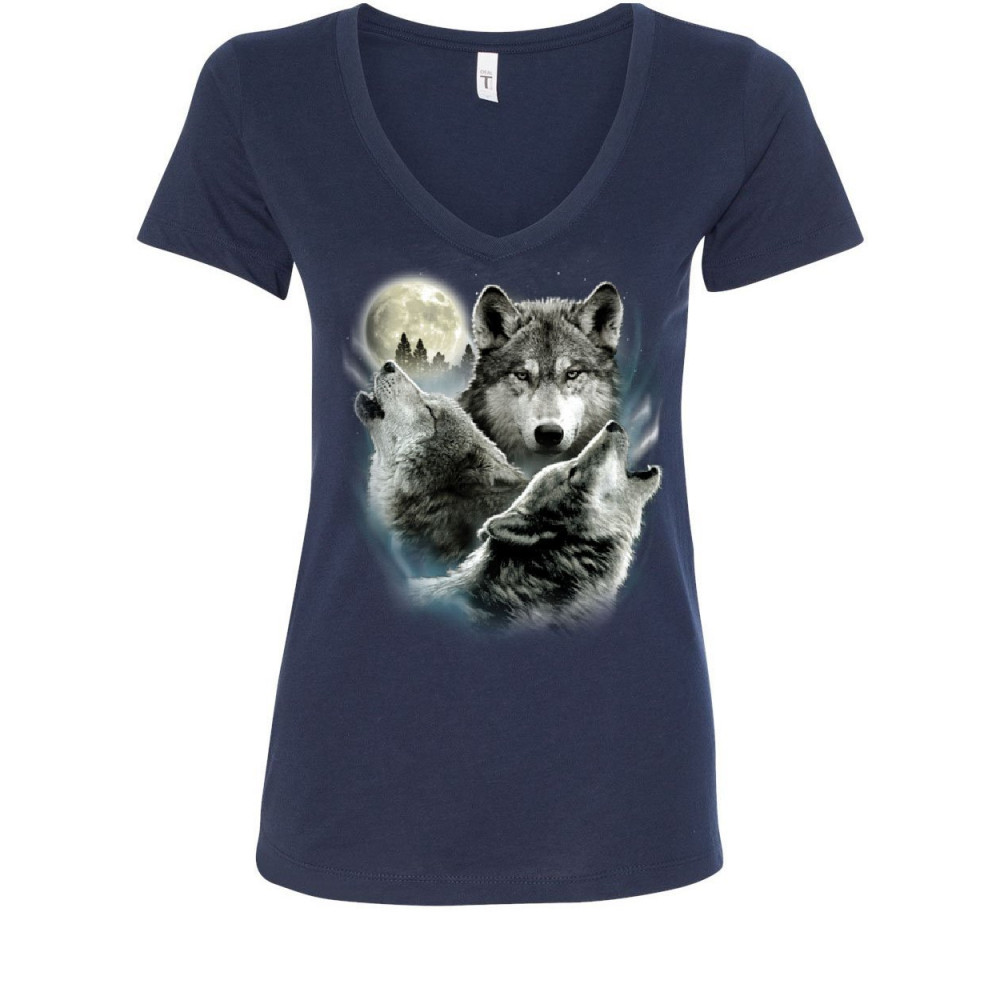 WOLF PACK HOWLING UP TO THE MOON howling wolf pack women's v-neck t-shirt wild wilderness animals nature moon navy blue