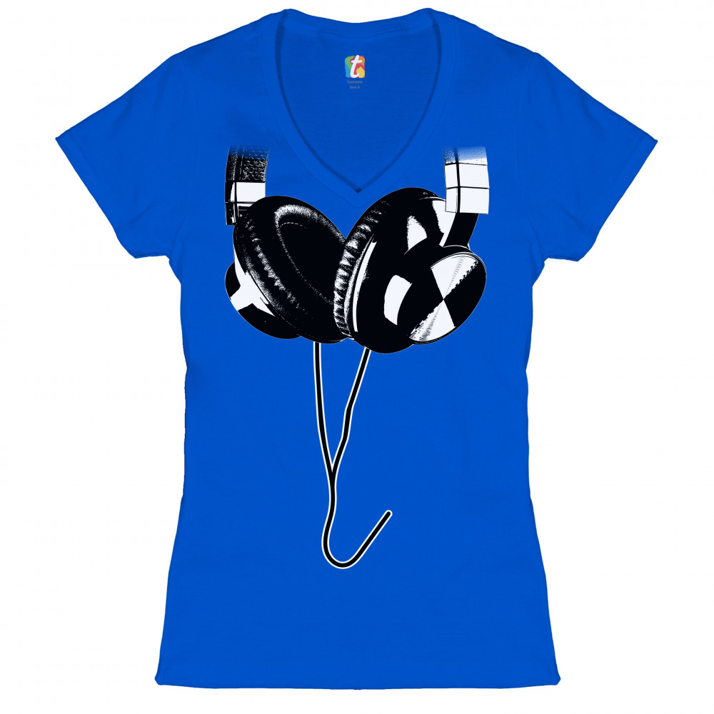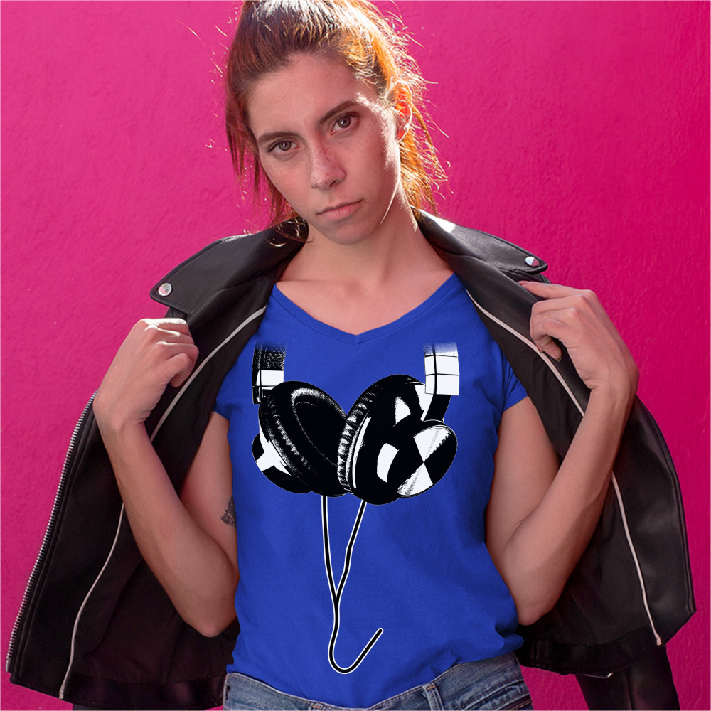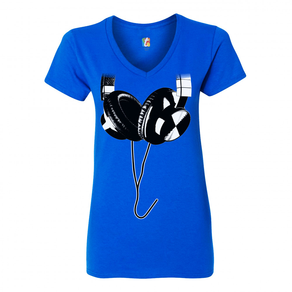 HUGE HANGING HEADPHONES women's v-neck t-shirt dj music tee royal blue