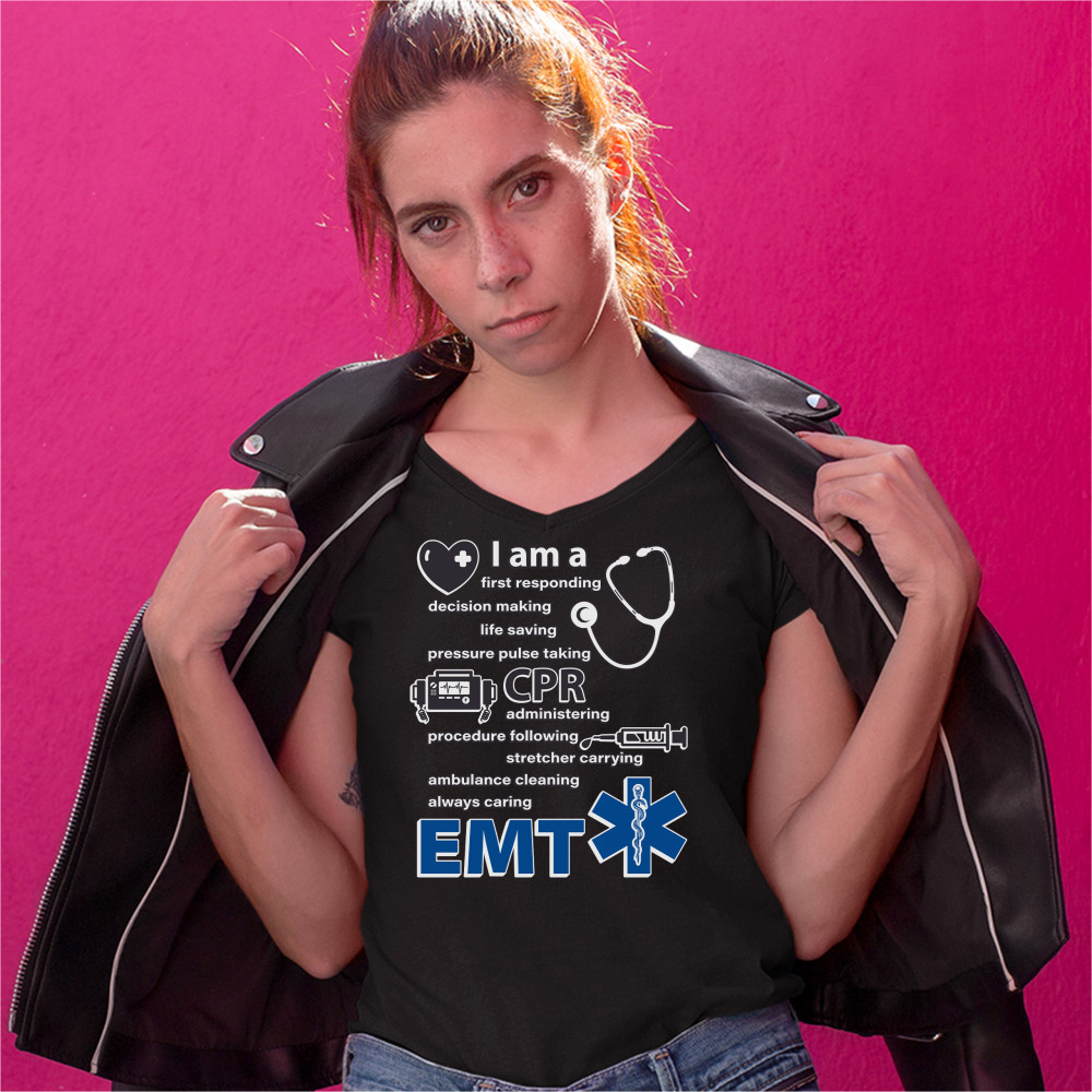 A print saying "I am a first responding, decision making, life saving, pressure pulse taking, CPR administering, procedure following, stretcher carrying, ambulance cleaning, always caring EMT". The print also features images of a heart, a stethoscope, a defibrillator, a syringe and the Star of Life. A great choice as a gift for a first responder.