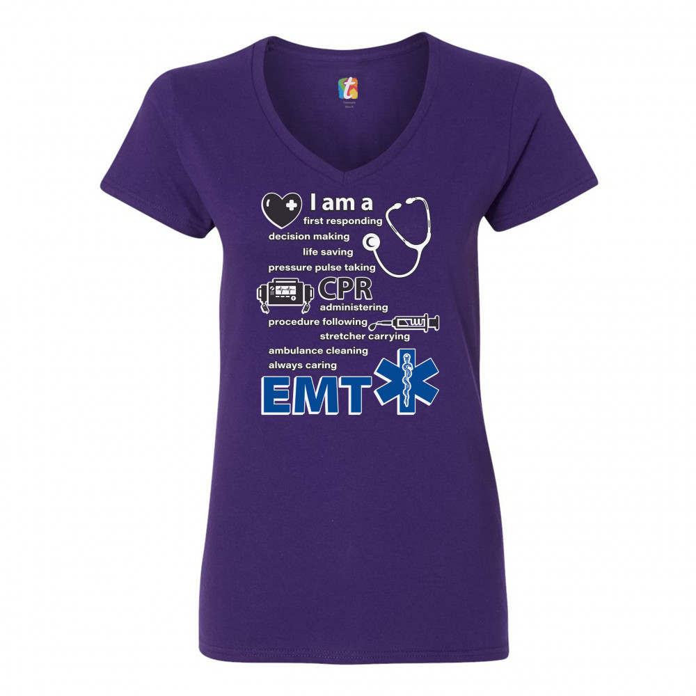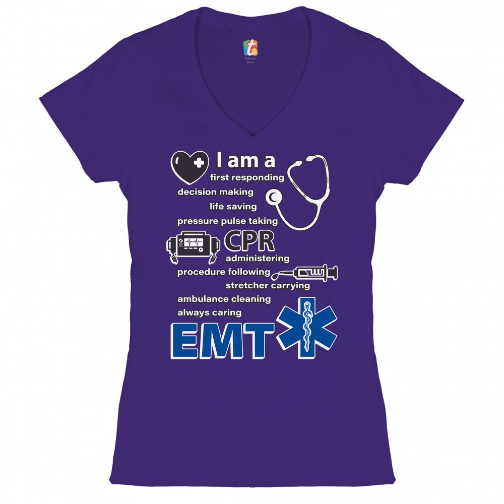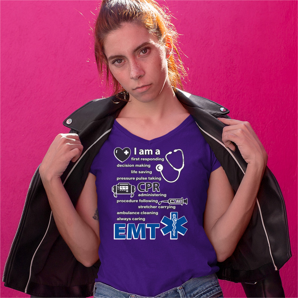 A print saying "I am a first responding, decision making, life saving, pressure pulse taking, CPR administering, procedure following, stretcher carrying, ambulance cleaning, always caring EMT". The print also features images of a heart, a stethoscope, a defibrillator, a syringe and the Star of Life. A great choice as a gift for a first responder.