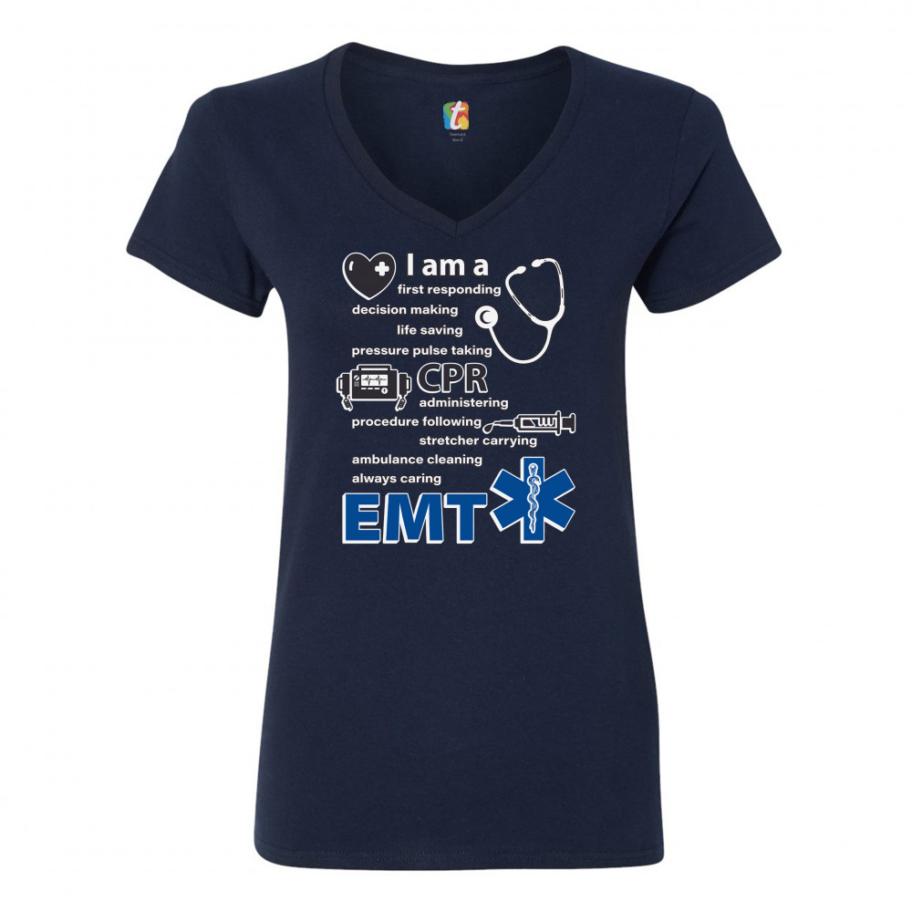 A print saying "I am a first responding, decision making, life saving, pressure pulse taking, CPR administering, procedure following, stretcher carrying, ambulance cleaning, always caring EMT". The print also features images of a heart, a stethoscope, a defibrillator, a syringe and the Star of Life. A great choice as a gift for a first responder.