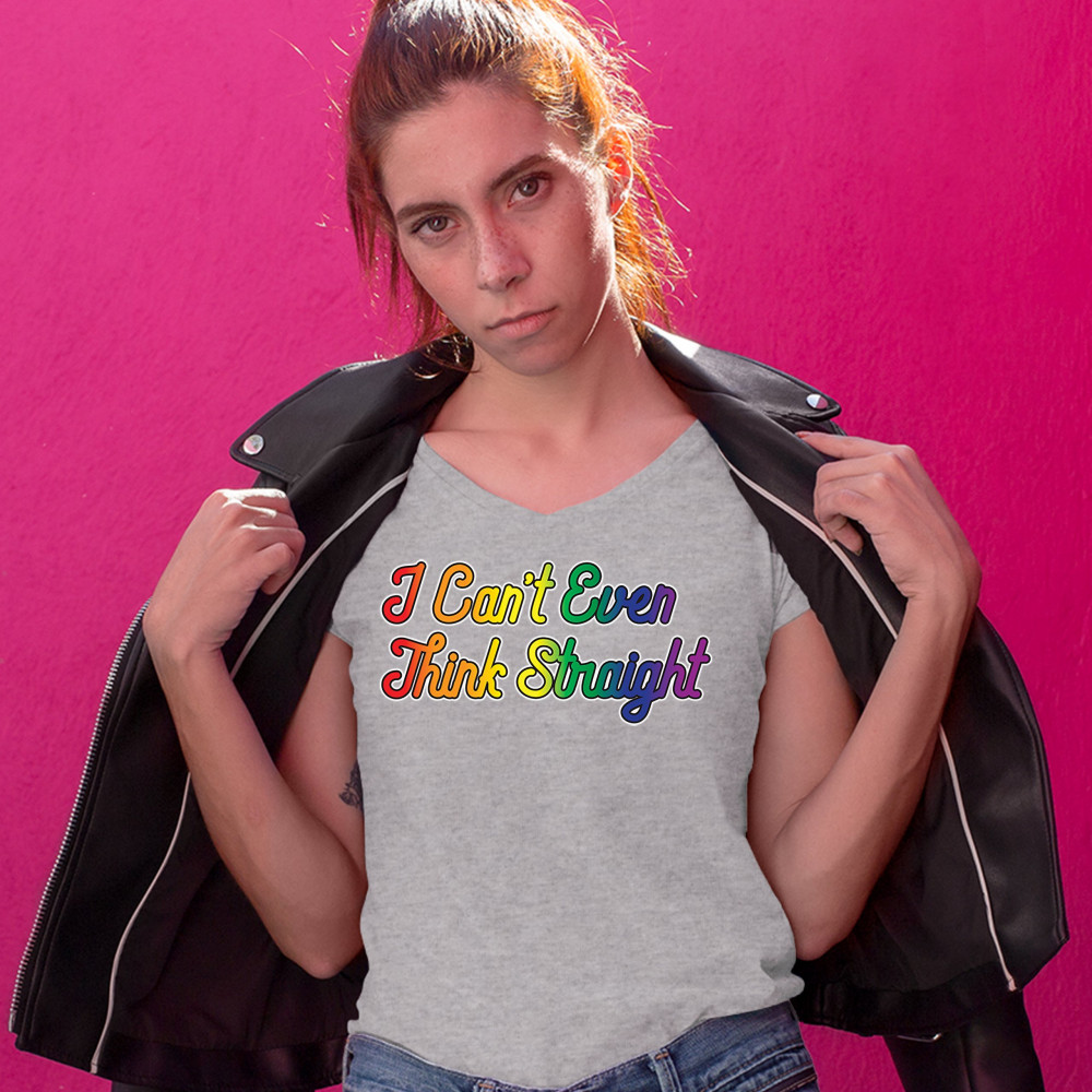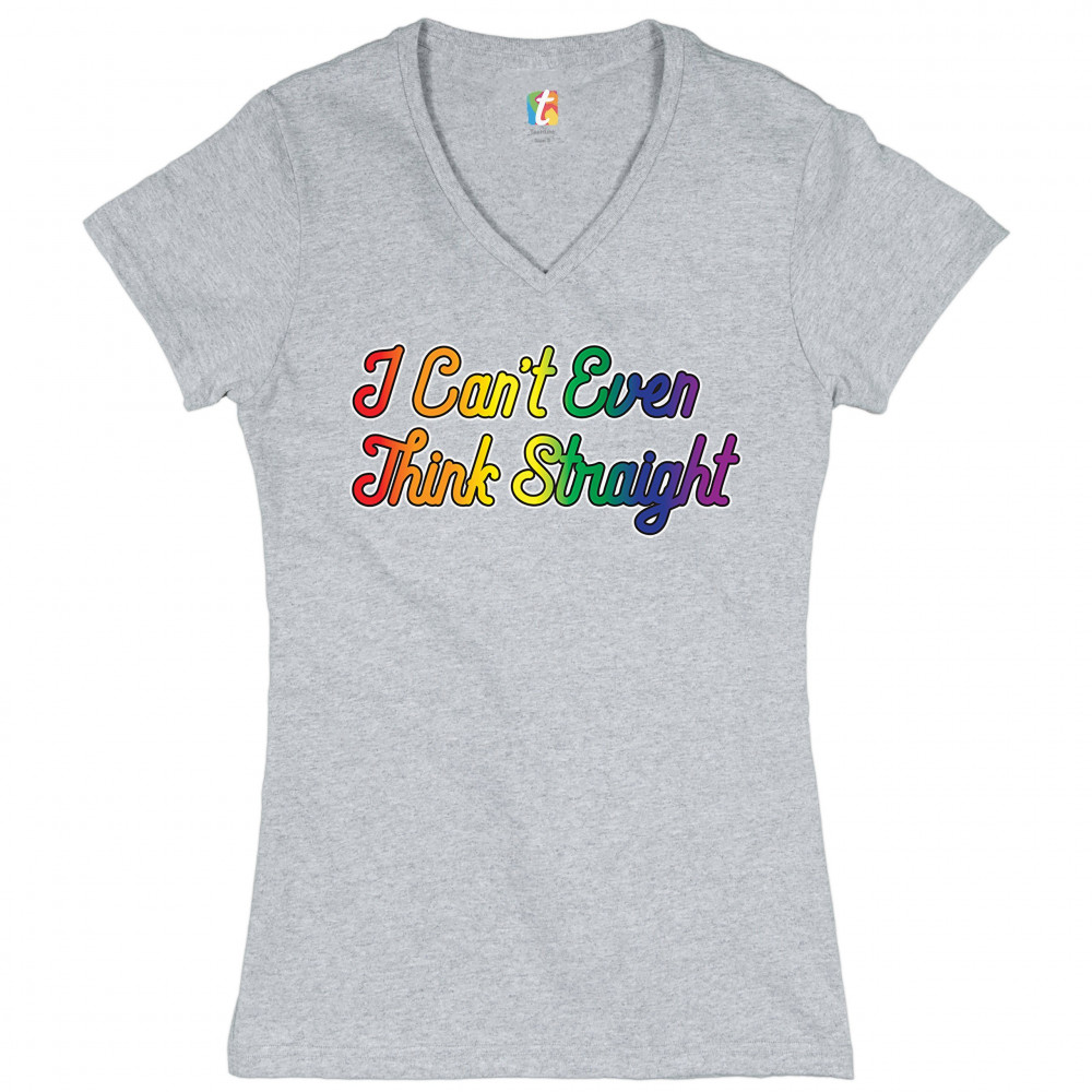 I CAN'T EVEN THINK STRAIGHT women's v-neck t-shirt lgbt rainbow gay pride tee gray