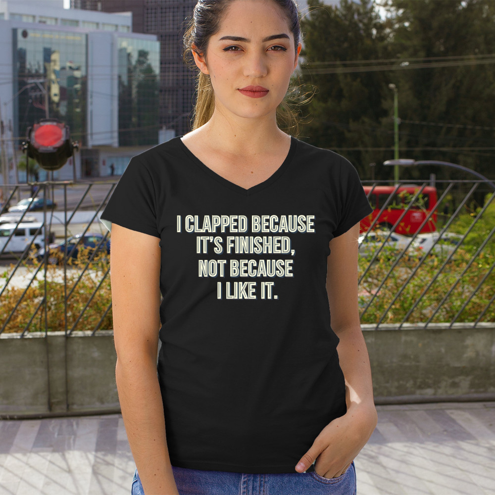 I CLAPPED BECAUSE IT'S FINISHED NOT BECAUSE I LIKE IT i clapped because it's finished sarcastic women's v-neck t-shirt funny tee black