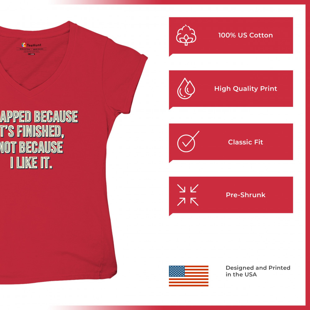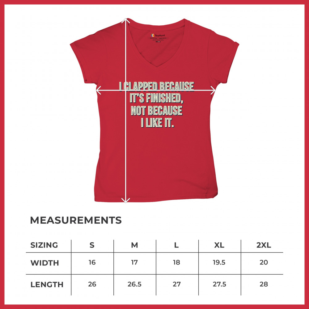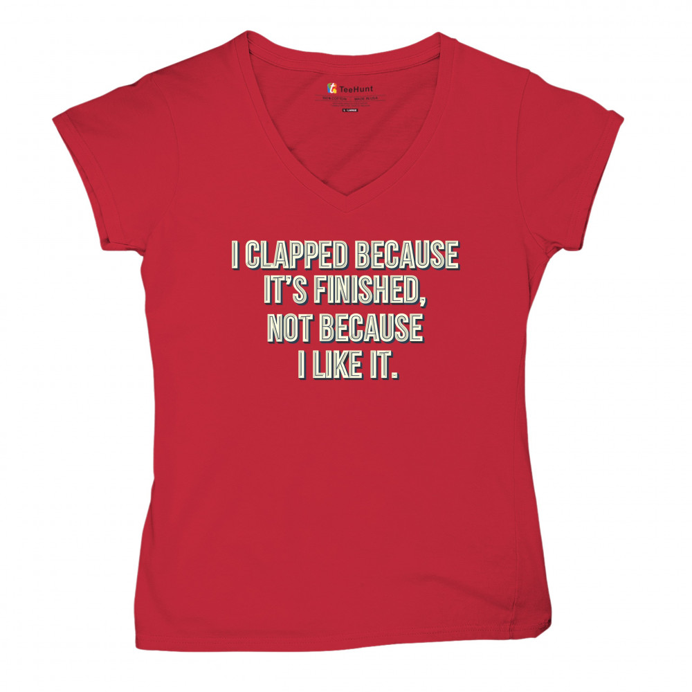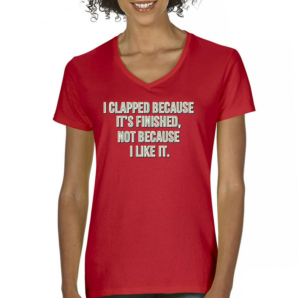 I CLAPPED BECAUSE IT'S FINISHED NOT BECAUSE I LIKE IT i clapped because it's finished sarcastic women's v-neck t-shirt funny tee red