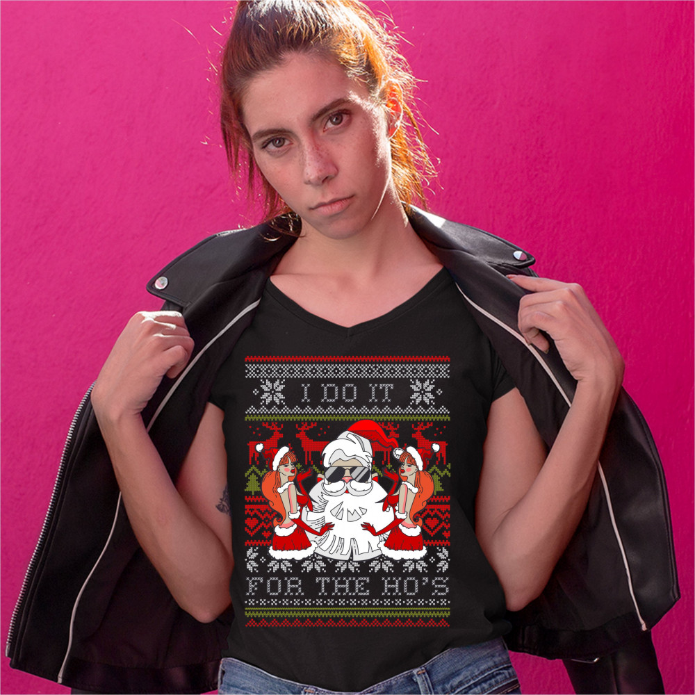 A funny print saying: "I do it for the ho's". It features a badass Santa Claus wearing sunglasses and two sexy girls in revealing Christmas outfits leaning on Santa's beard. The print is decorated wit the ugly sweater pattern in the background. Amazing ch