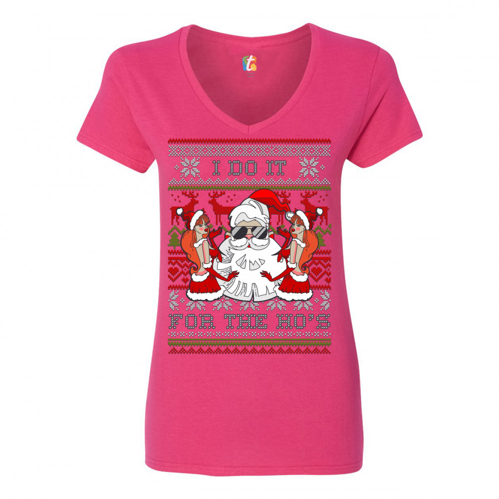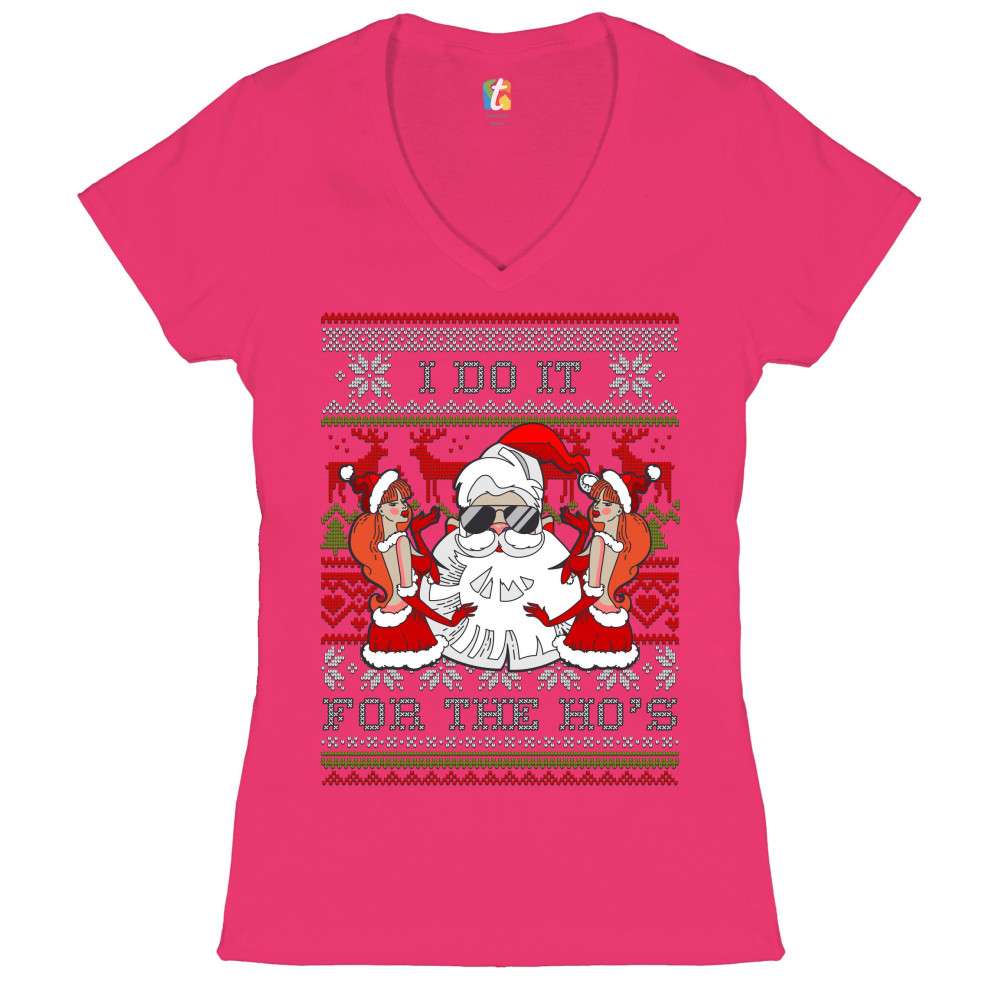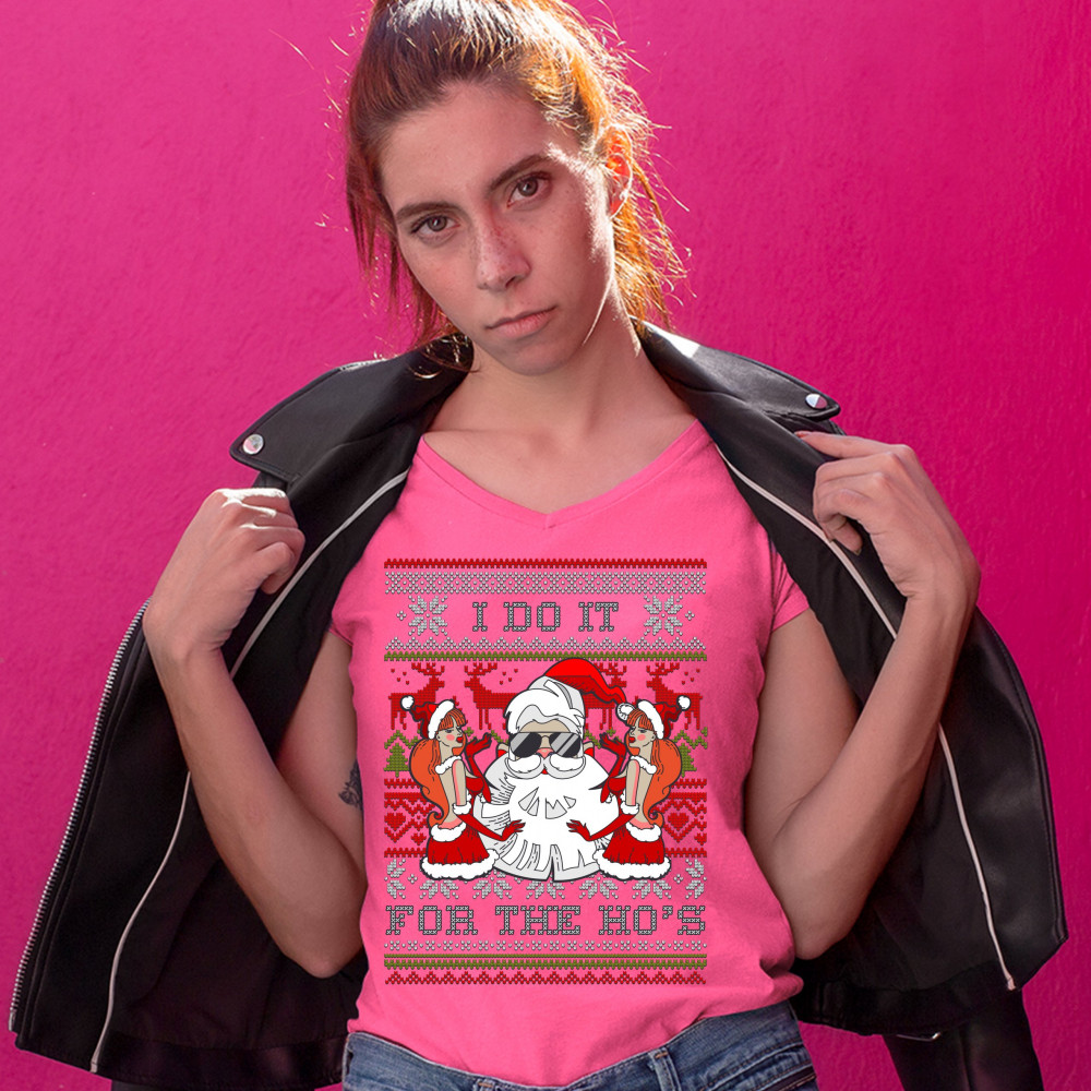 A funny print saying: "I do it for the ho's". It features a badass Santa Claus wearing sunglasses and two sexy girls in revealing Christmas outfits leaning on Santa's beard. The print is decorated wit the ugly sweater pattern in the background. Amazing ch
