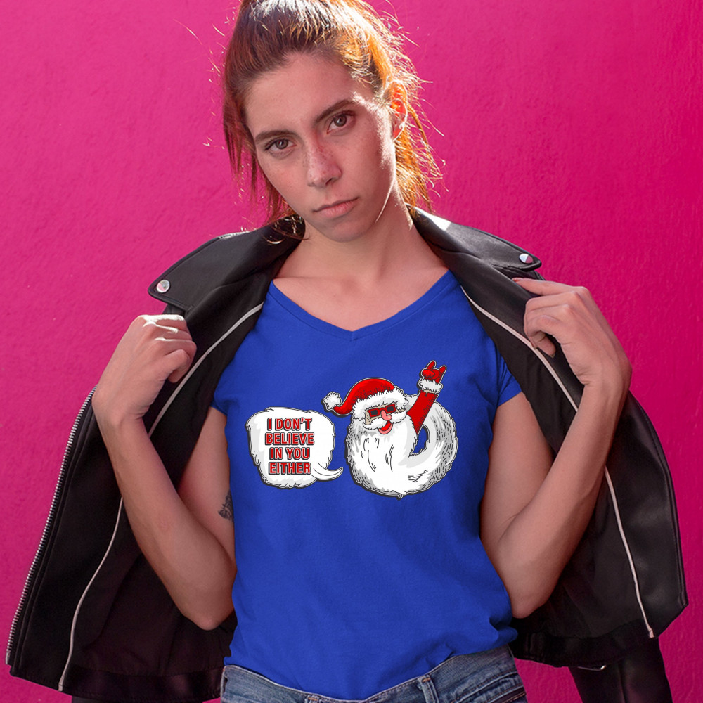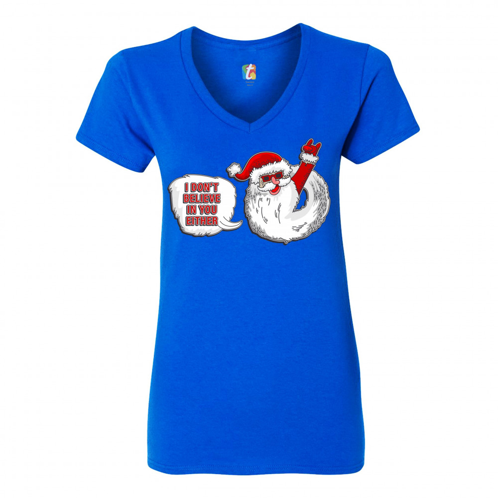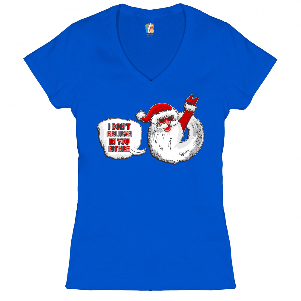 I DON'T BELIEVE IN YOU EITHER women's v-neck t-shirt santa claus christmas tee royal blue