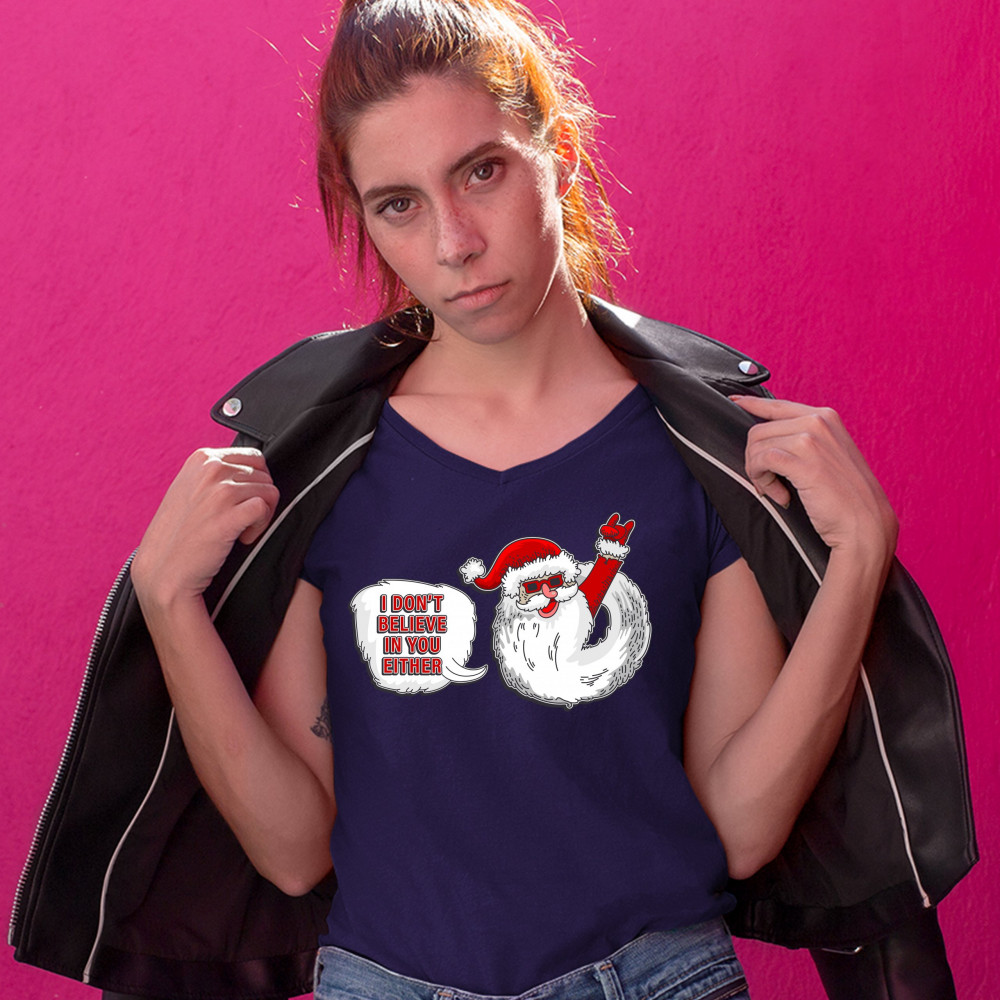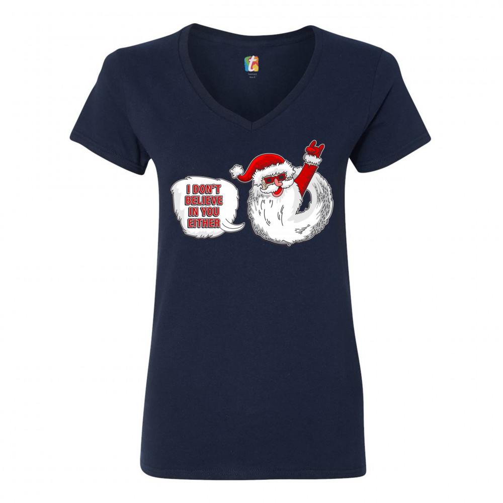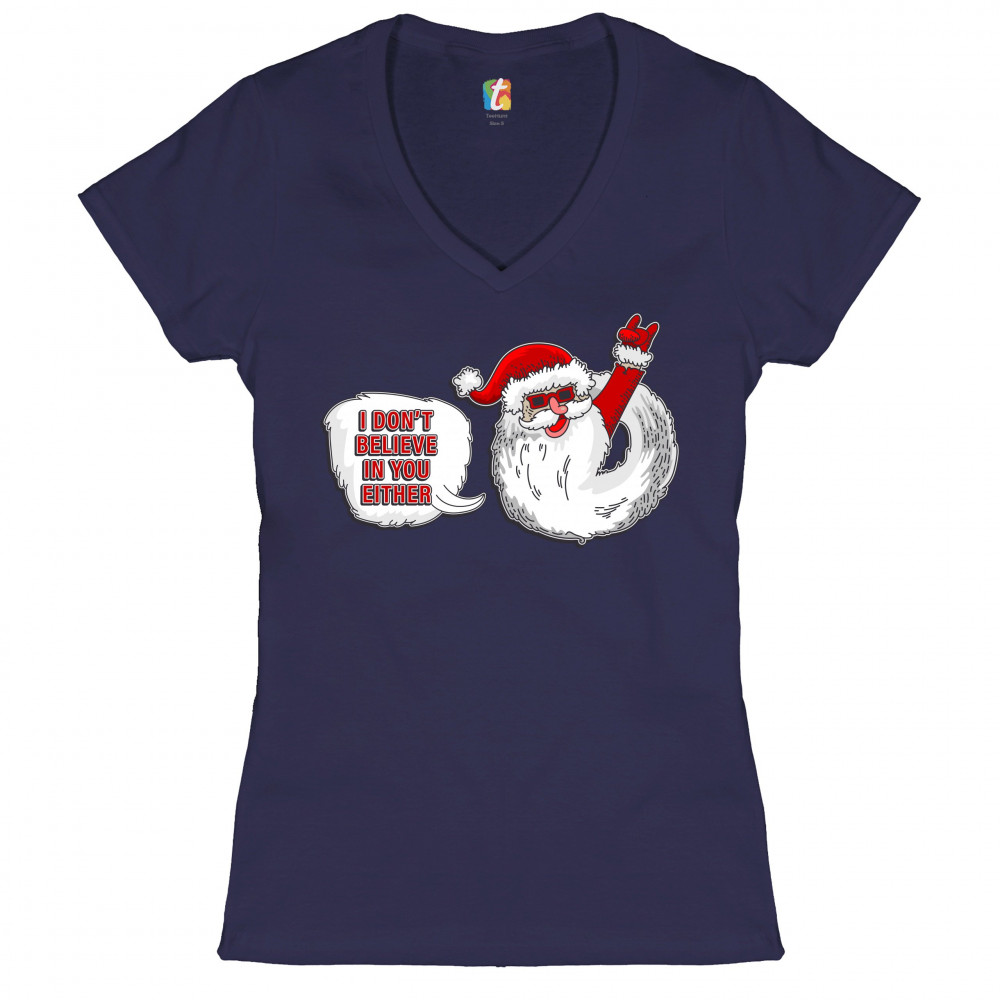 I DON'T BELIEVE IN YOU EITHER women's v-neck t-shirt santa claus christmas tee navy blue
