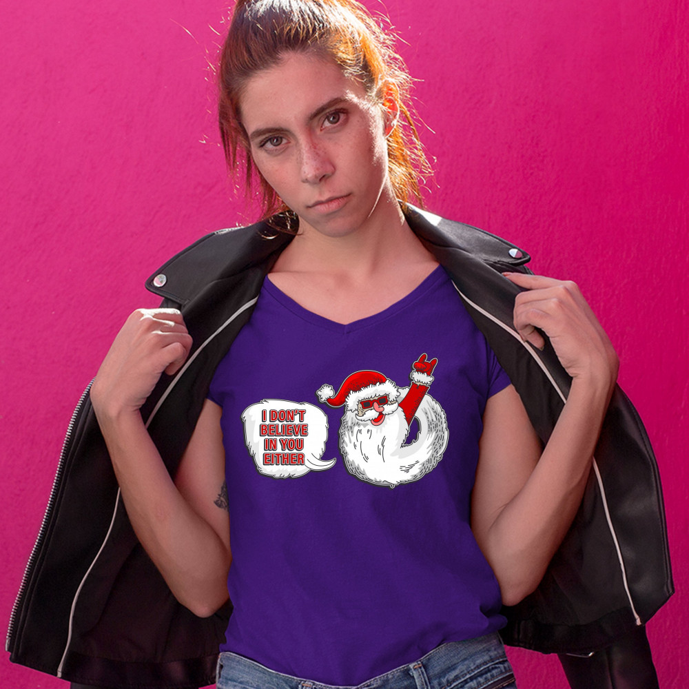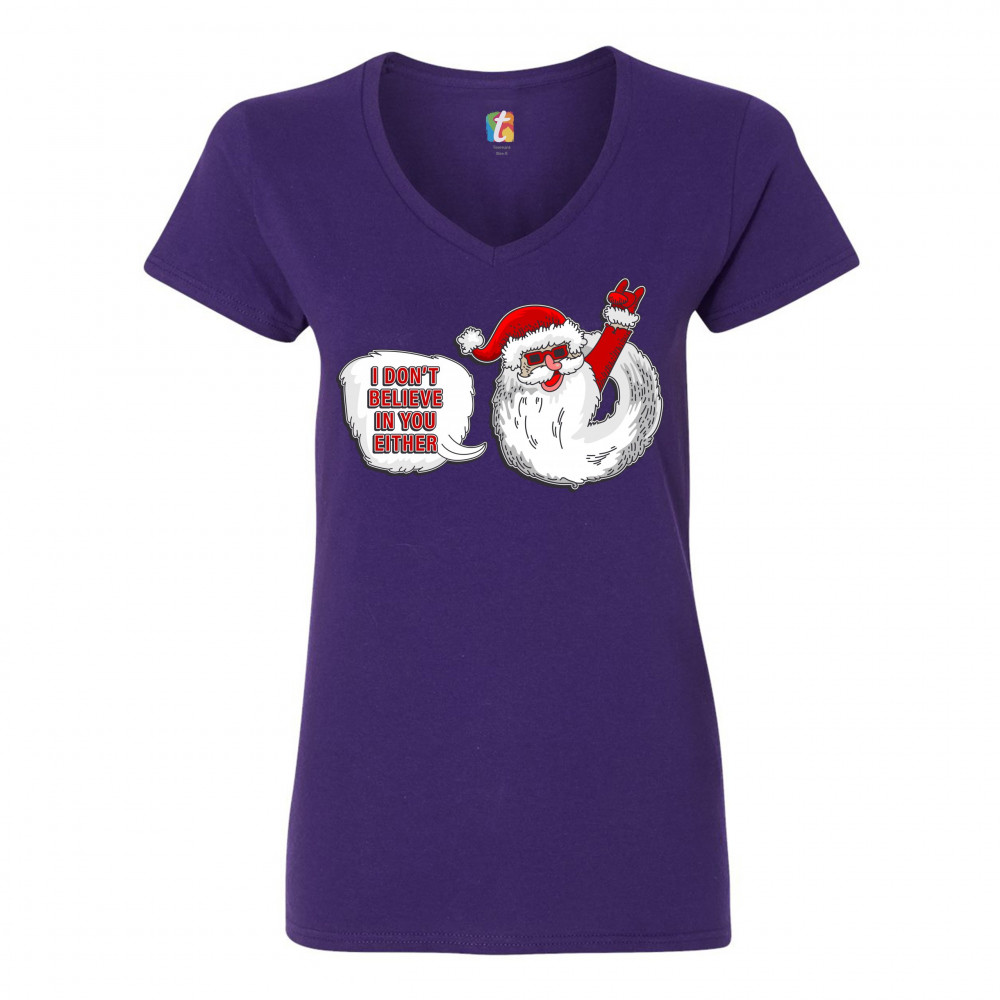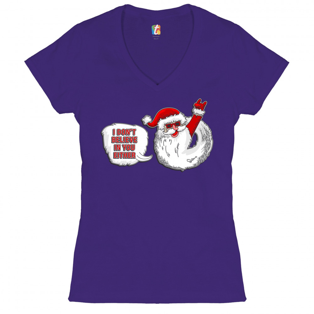 I DON'T BELIEVE IN YOU EITHER women's v-neck t-shirt santa claus christmas tee purple