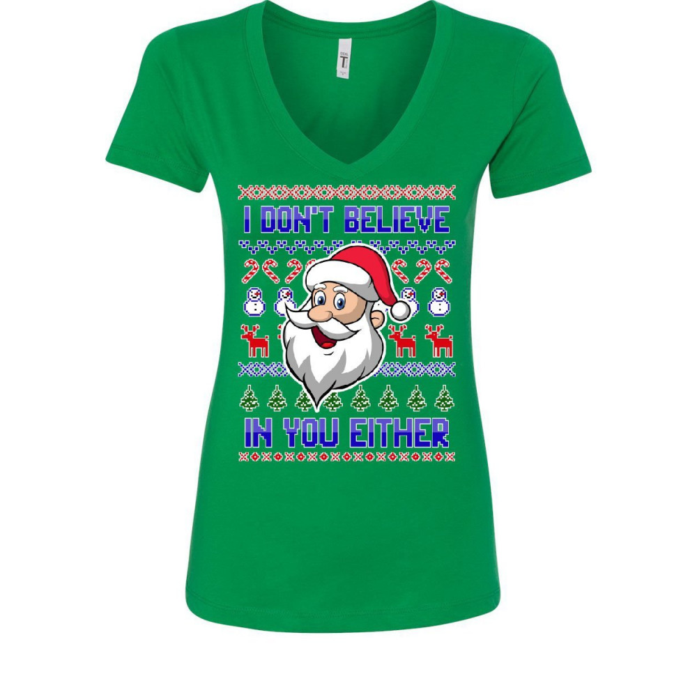I DON'T BELIEVE IN YOU EITHER women's v-neck t-shirt christmas xmas santa ugly green
