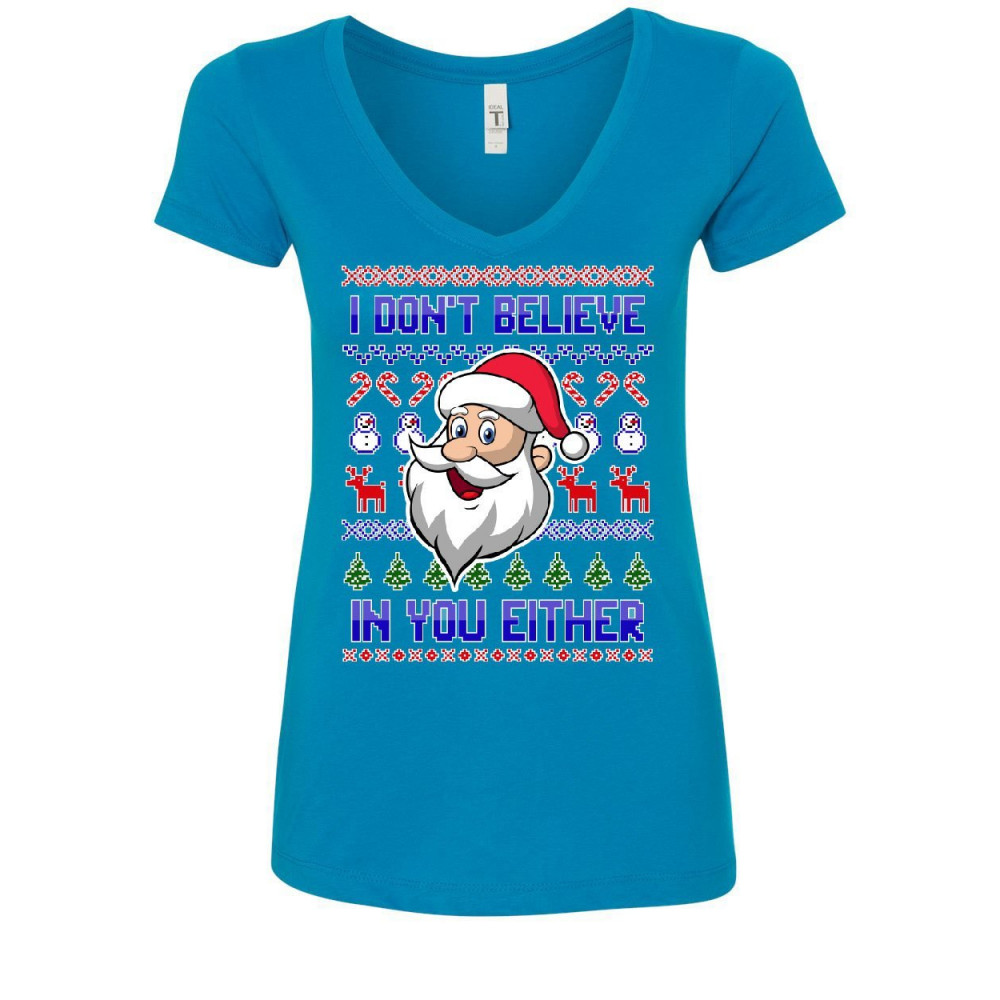 I DON'T BELIEVE IN YOU EITHER women's v-neck t-shirt christmas xmas santa ugly turquoise