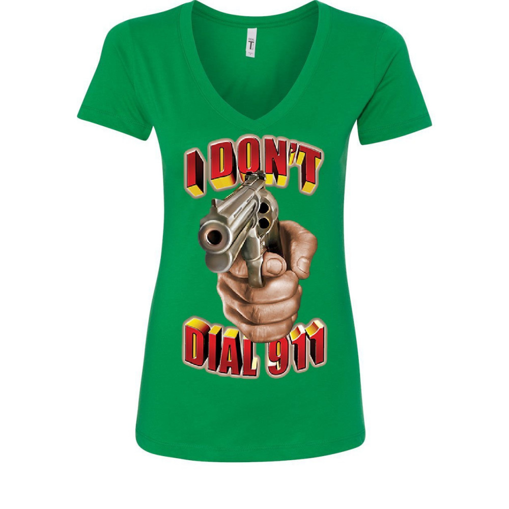I DON'T DIAL 911 women's v-neck t-shirt defend 2nd amendment pro guns revolver green