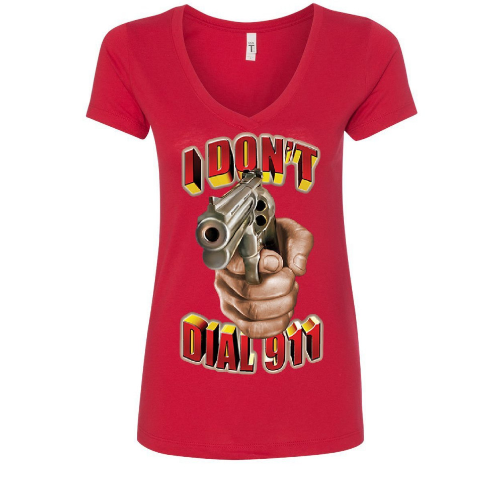 I DON'T DIAL 911 women's v-neck t-shirt defend 2nd amendment pro guns revolver red