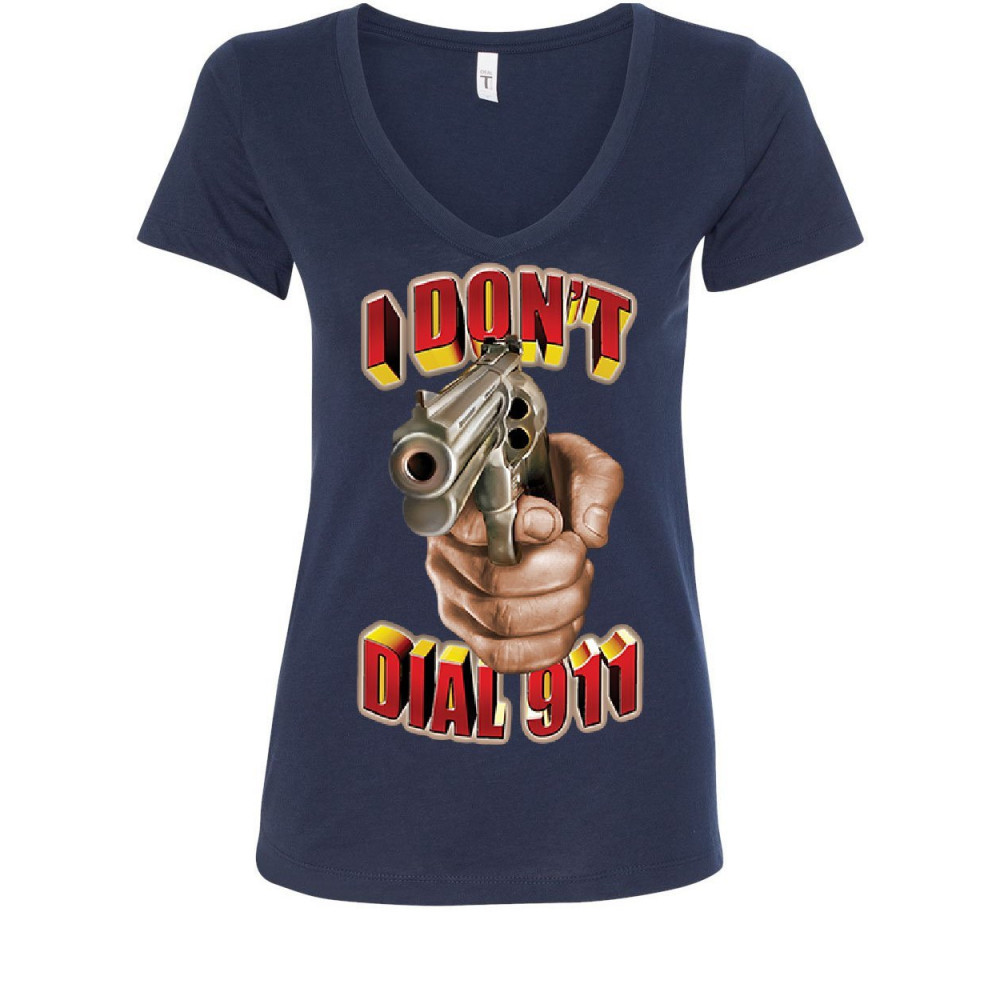 I DON'T DIAL 911 women's v-neck t-shirt defend 2nd amendment pro guns revolver navy blue