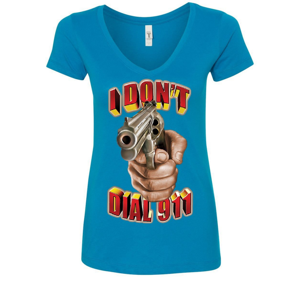 I DON'T DIAL 911 women's v-neck t-shirt defend 2nd amendment pro guns revolver turquoise