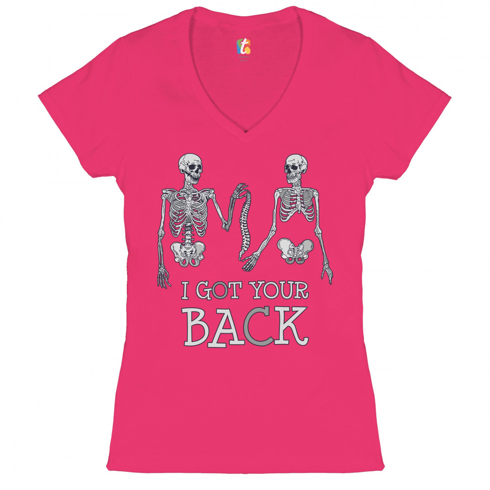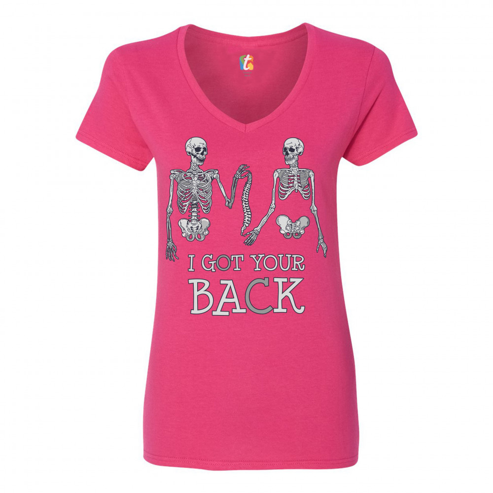 I GOT YOUR BACK women's v-neck t-shirt happy halloween spooky skeletons tee pink