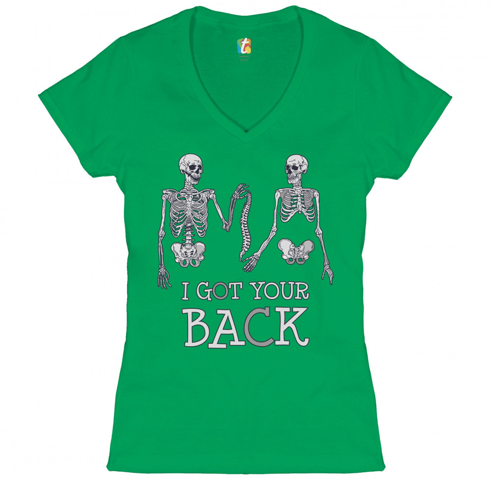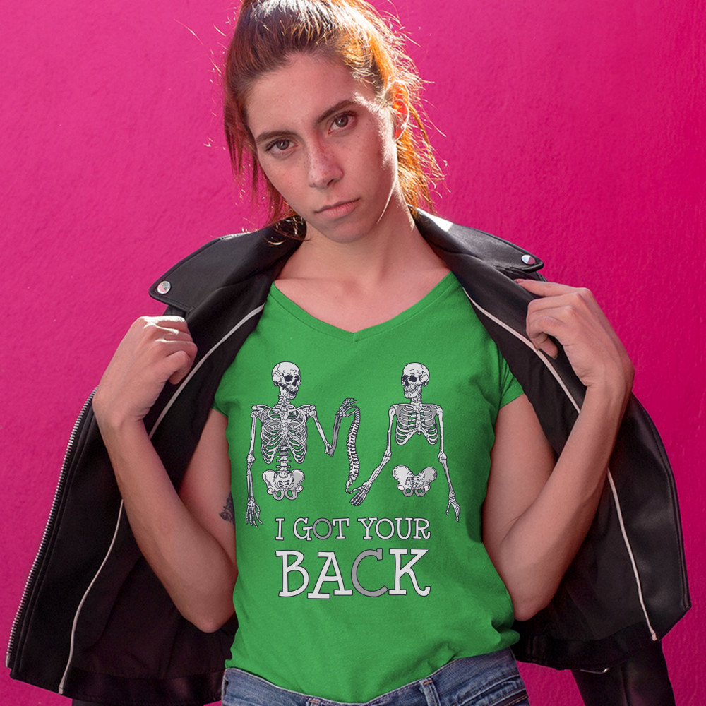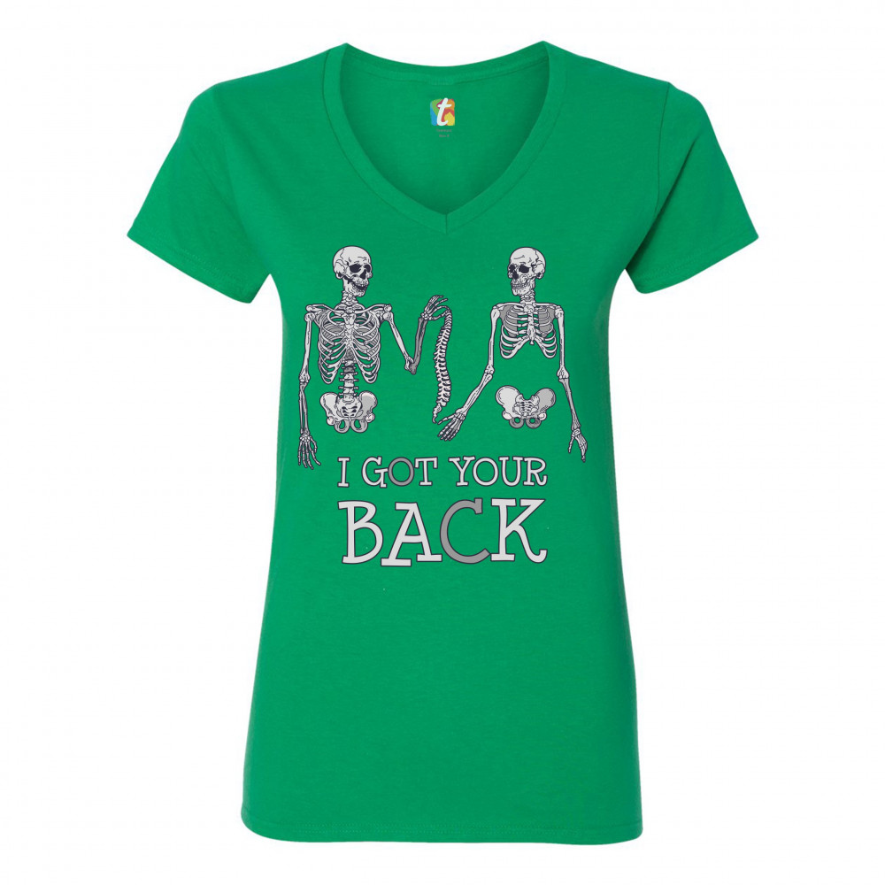 I GOT YOUR BACK women's v-neck t-shirt happy halloween spooky skeletons tee green