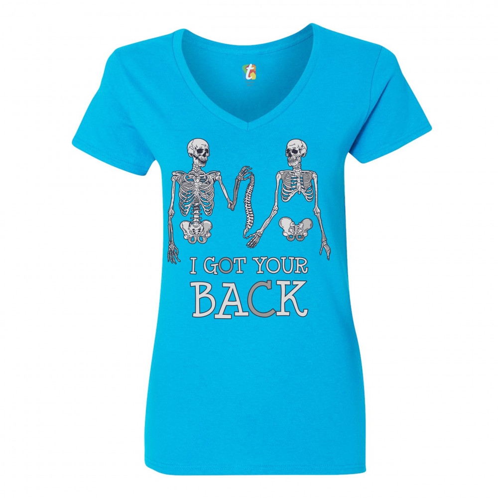 I GOT YOUR BACK women's v-neck t-shirt happy halloween spooky skeletons tee turquoise